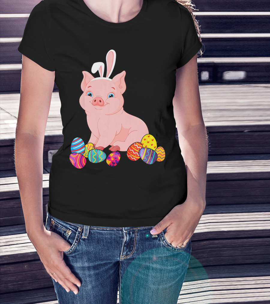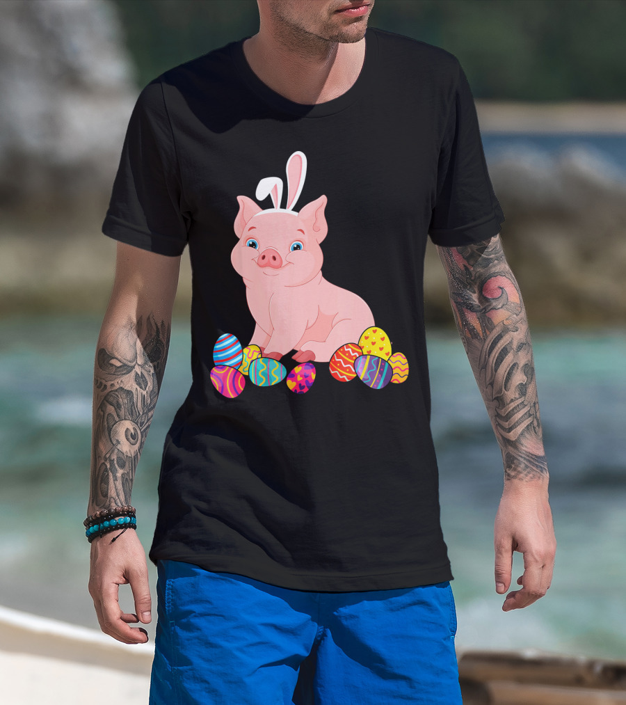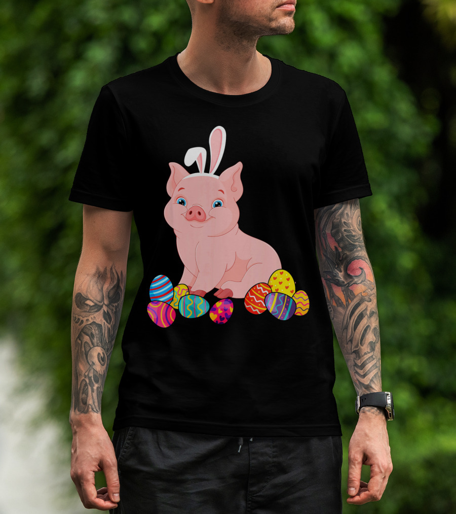 Pig With Bunny Ears Surrounded By Colorful Easter Eggs Easter Day T-Shirt