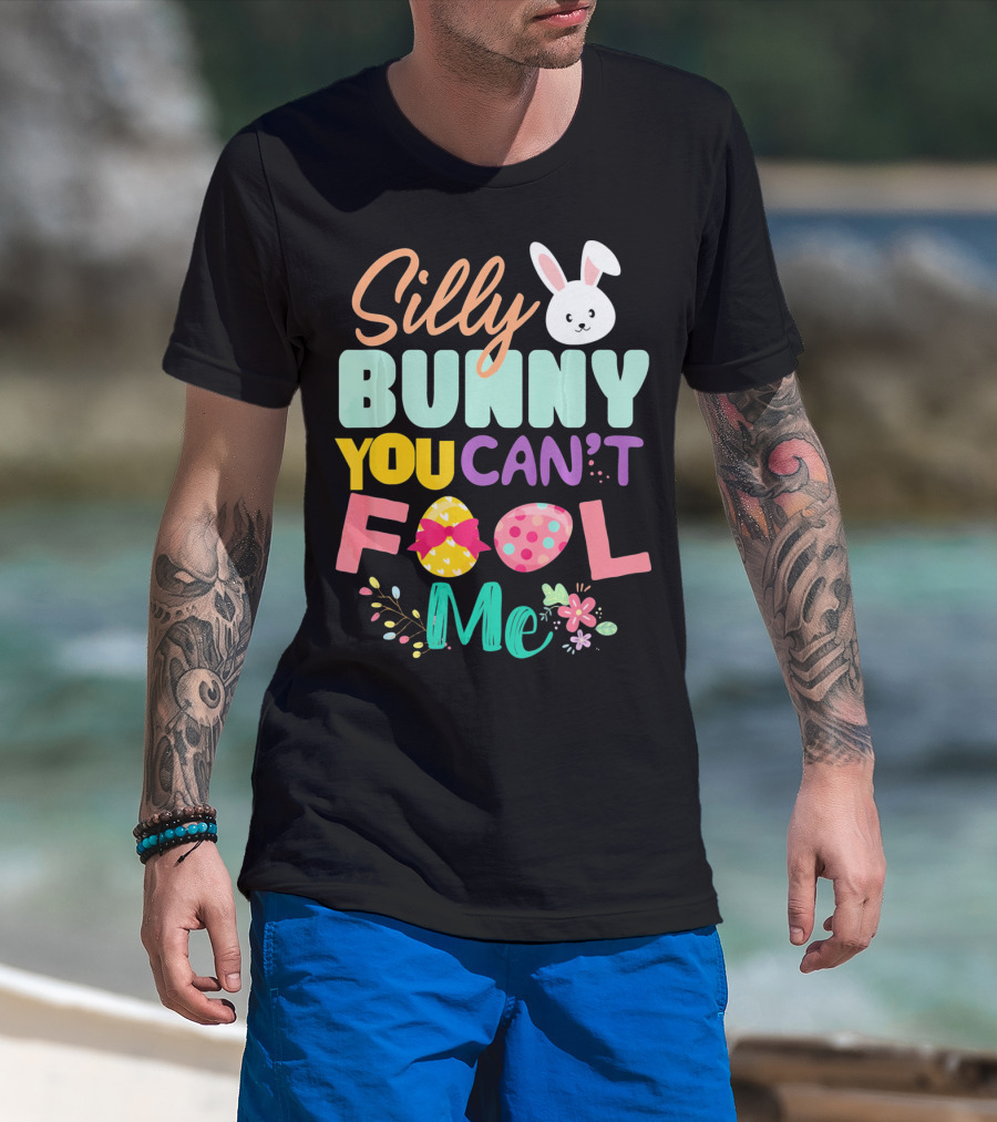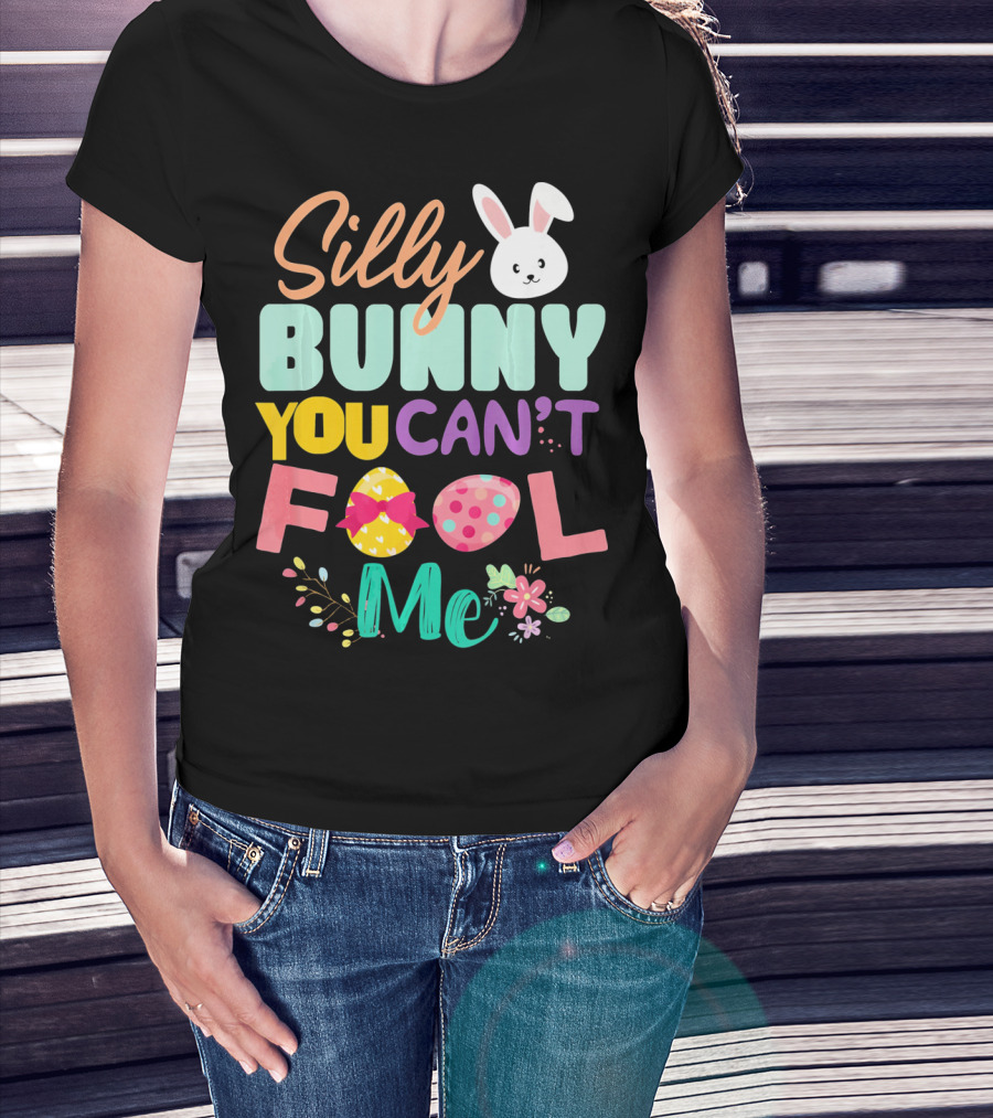 The Silly Bunny You Can't Fool Me Easter Eggs Floral T-shirt is designed for everyday wear and a consistent fit. Fabric is pre-shrunk ring-spun cotton with durable stitching. See the size chart below for exact measurements.
