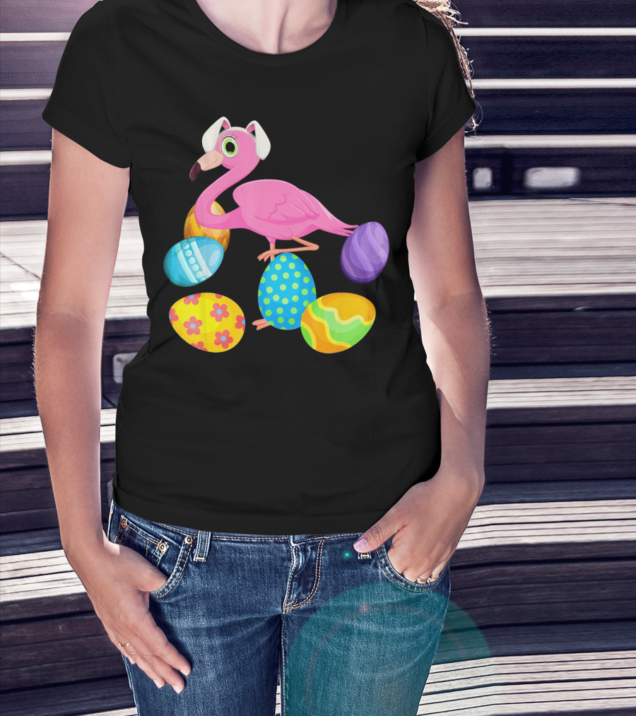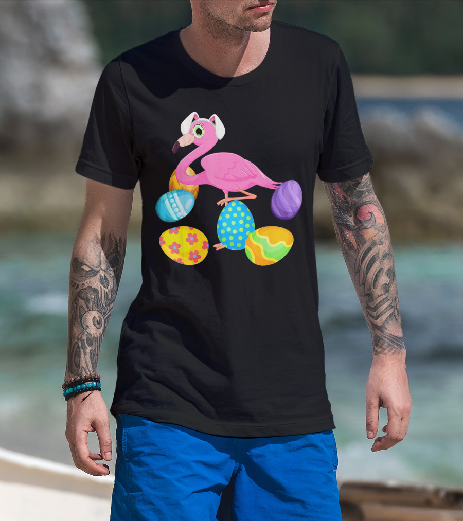 Flamingo Bunny Rabbit Hat With Colorful Easter Eggs Playing Easter T-Shirt
