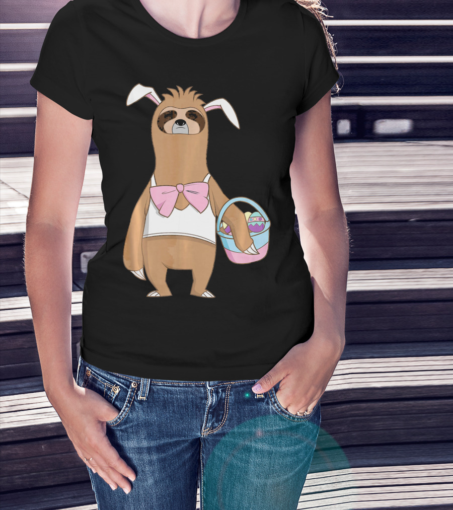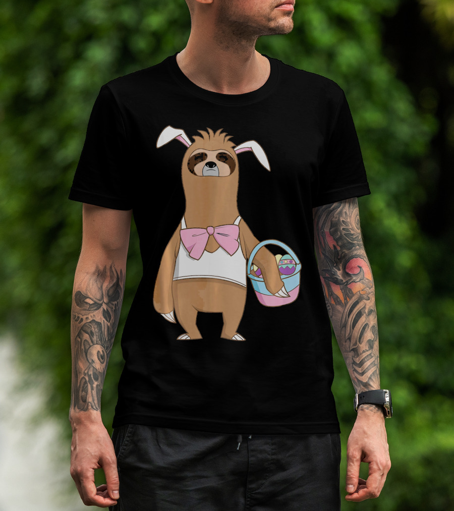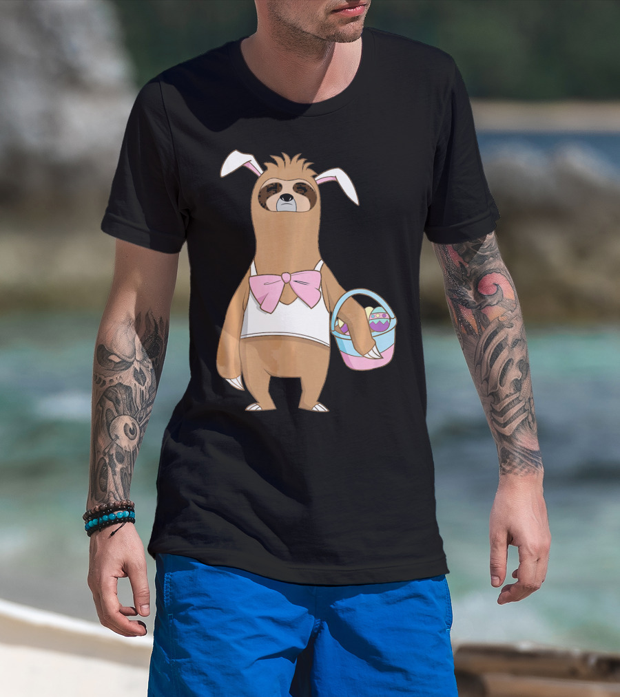 Sloth Easter Bunny Lazy Rabbit With Basket Of Eggs T-Shirt