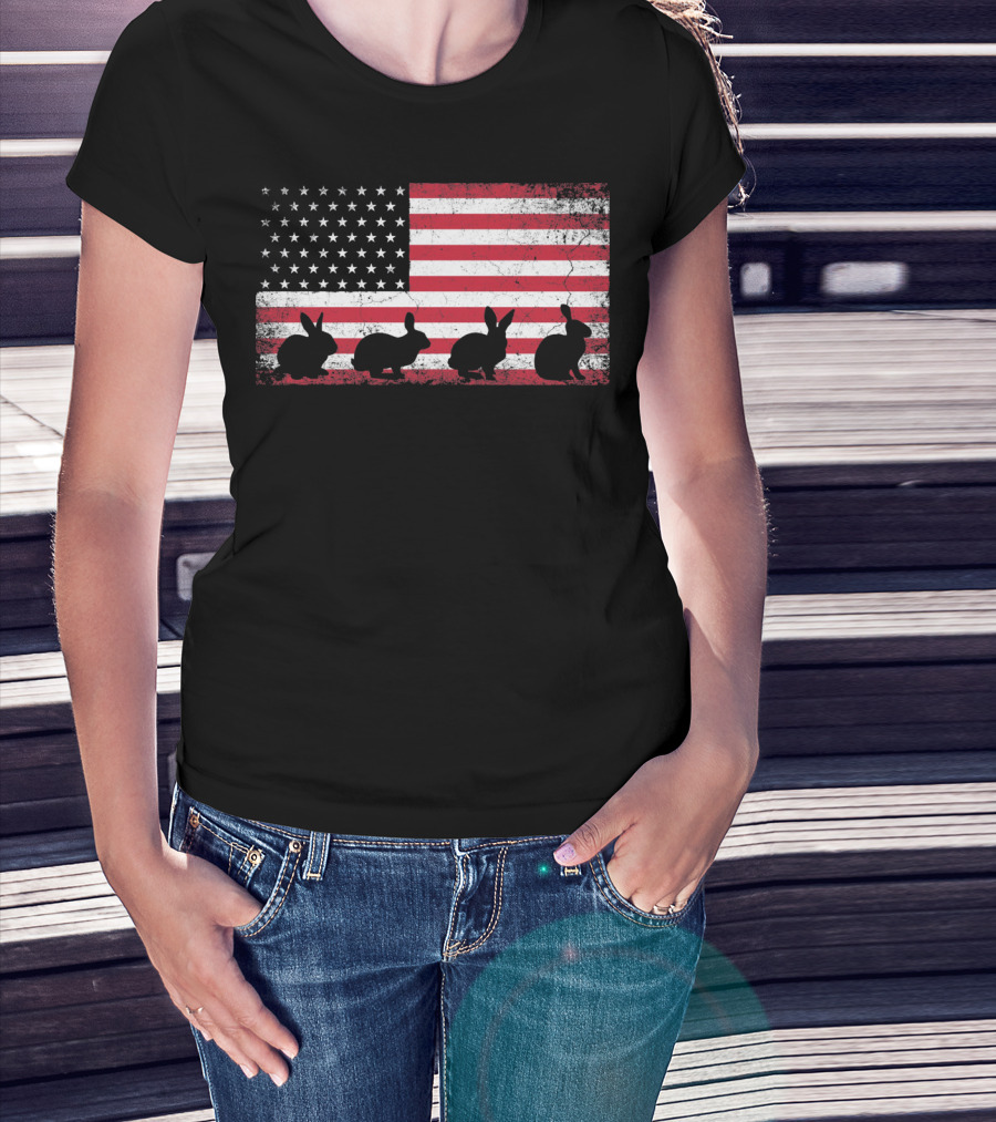 The American Flag Bunny Rabbit Silhouettes Retro Easter T-shirt is designed for everyday wear and a consistent fit. Fabric is pre-shrunk ring-spun cotton with durable stitching. See the size chart below for exact measurements.