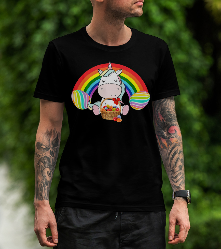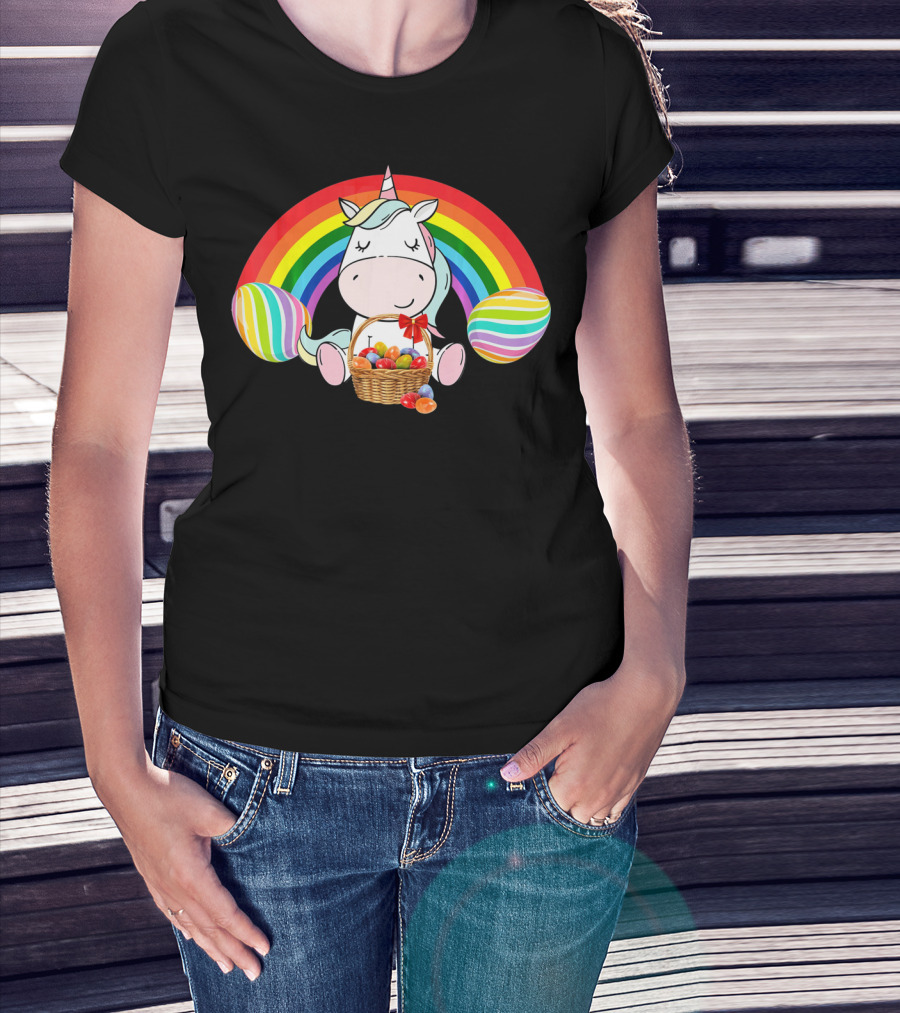 Unicorn Easter With Rainbow And Basket Of Eggs T-Shirt