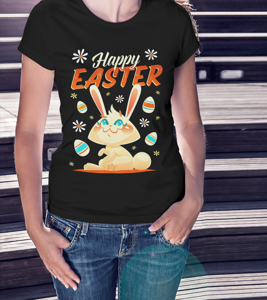 The Happy Easter Bunny Surrounded by Colorful Eggs and Daisies T-shirt is designed for everyday wear and a consistent fit. Fabric is pre-shrunk ring-spun cotton with durable stitching. See the size chart below for exact measurements.