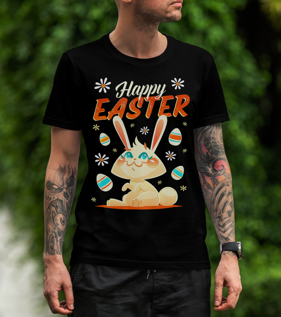 Happy Easter Bunny Surrounded By Colorful Eggs And Daisies T-Shirt