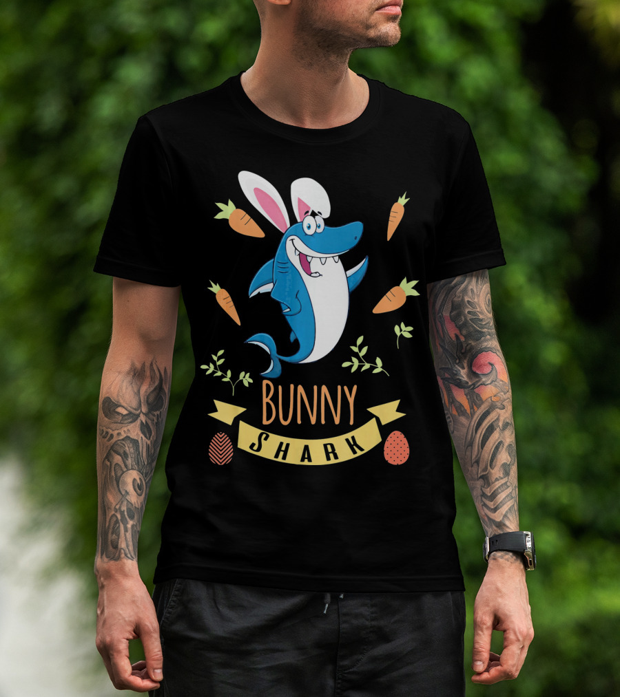 The Bunny Shark Easter Carrot Egg Adventure T-shirt is designed for everyday wear and a consistent fit. Fabric is pre-shrunk ring-spun cotton with durable stitching. See the size chart below for exact measurements.