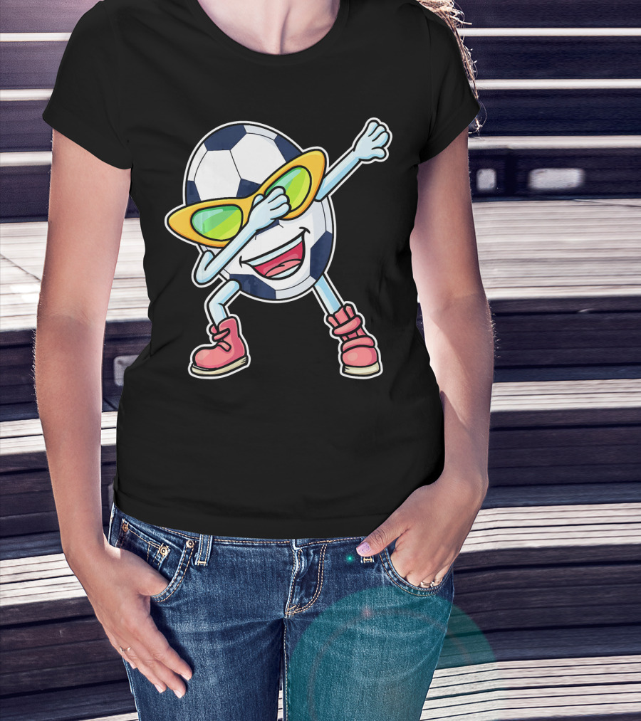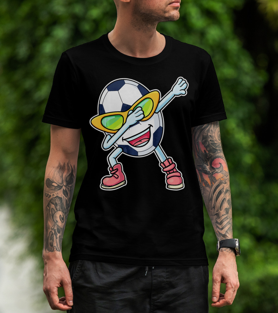 The Dabbing Soccer Ball Easter Egg Cartoon with Sunglasses T-shirt is designed for everyday wear and a consistent fit. Fabric is pre-shrunk ring-spun cotton with durable stitching. See the size chart below for exact measurements.