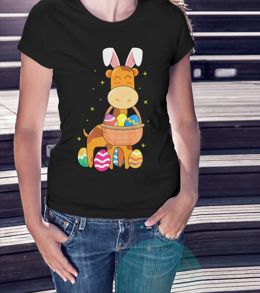 Giraffe Easter Egg Bunny Holding Basket Of Colorful Eggs And Wearing Bunny Ears T-Shirt