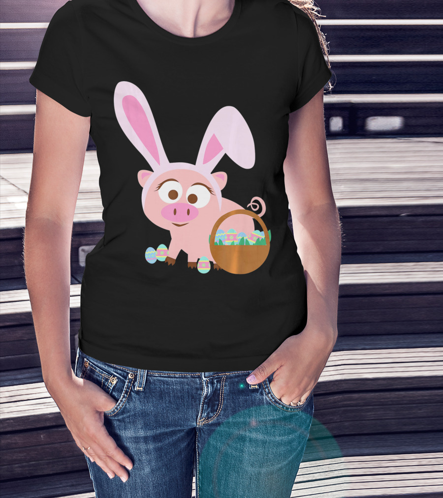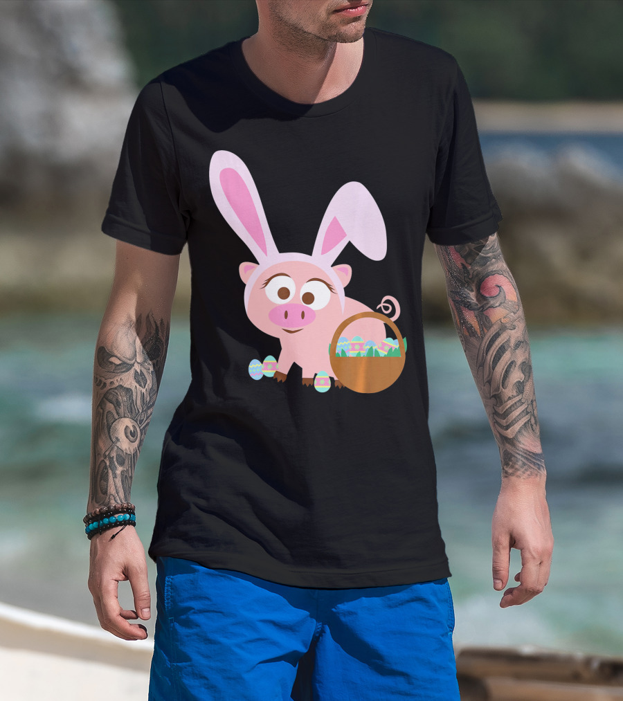Happy Pig Bunny Ears Easter Eggs Basket T-Shirt