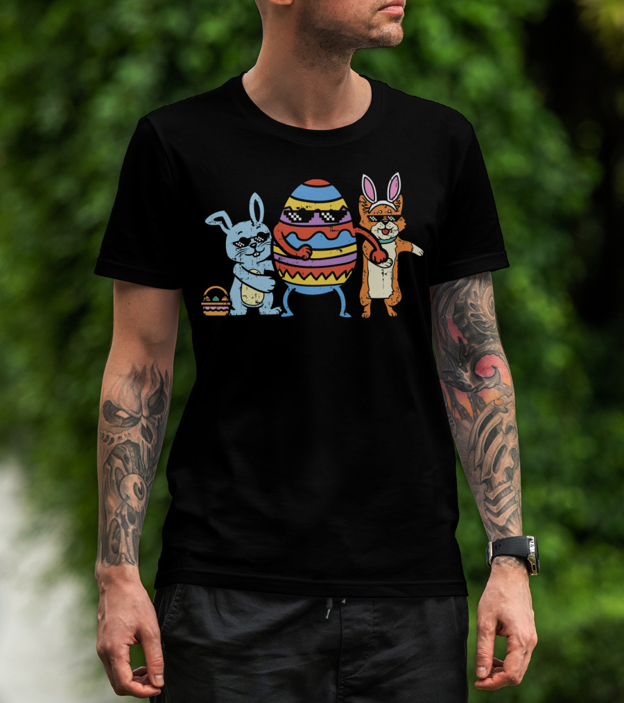 The Flossing Easter Crew Bunnies Dancing with Egg T-shirt is designed for everyday wear and a consistent fit. Fabric is pre-shrunk ring-spun cotton with durable stitching. See the size chart below for exact measurements.