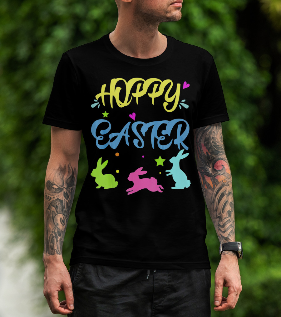 Hoppy Easter Novelty Orthodox Colorful Bunny Silhouettes With Hearts And Stars T-Shirt