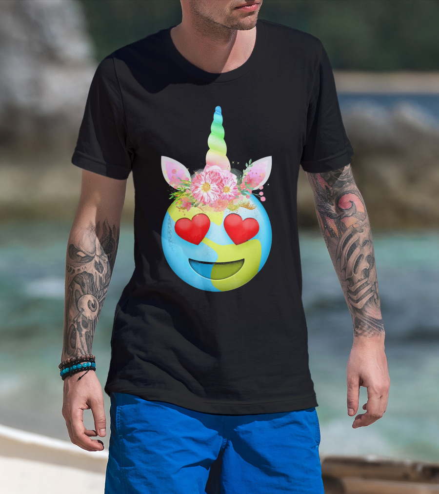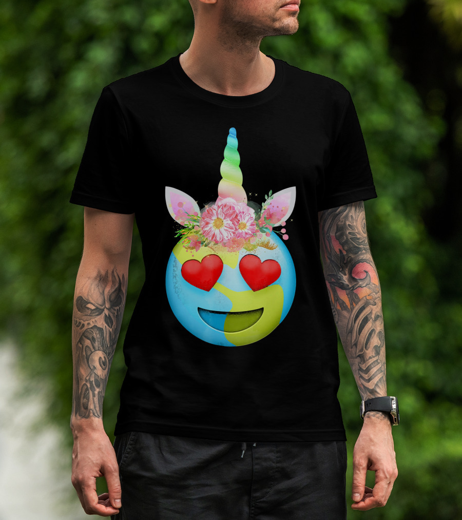 Heart Eyes Unicorn Earth Day Emoji Floral Mane T-Shirt