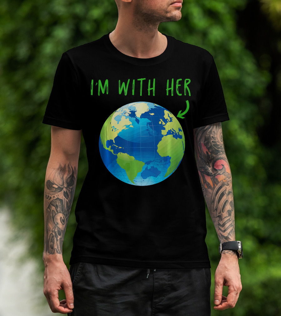 The I'm With Her Planet Earth Day T-shirt is designed for everyday wear and a consistent fit. Fabric is pre-shrunk ring-spun cotton with durable stitching. See the size chart below for exact measurements.