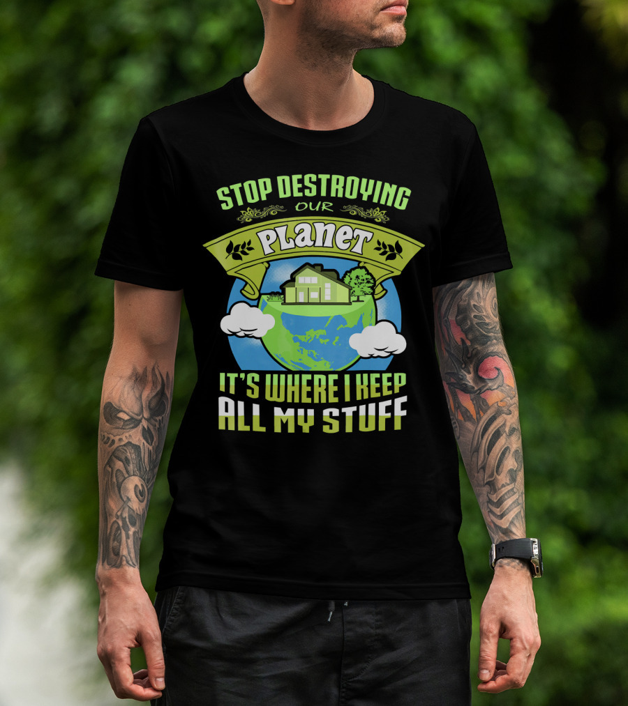 The Stop Destroying Our Planet It's Where I Keep All My Stuff T-shirt is designed for everyday wear and a consistent fit. Fabric is pre-shrunk ring-spun cotton with durable stitching. See the size chart below for exact measurements.