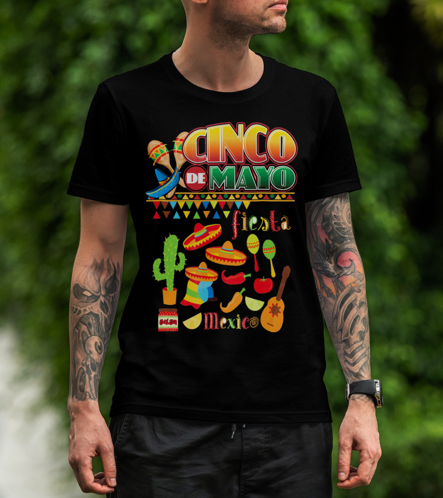 Cinco De Mayo Fiesta Mexico Cactus Sombrero Maracas Guitar Lime Chilli Peppers Icons T-Shirt