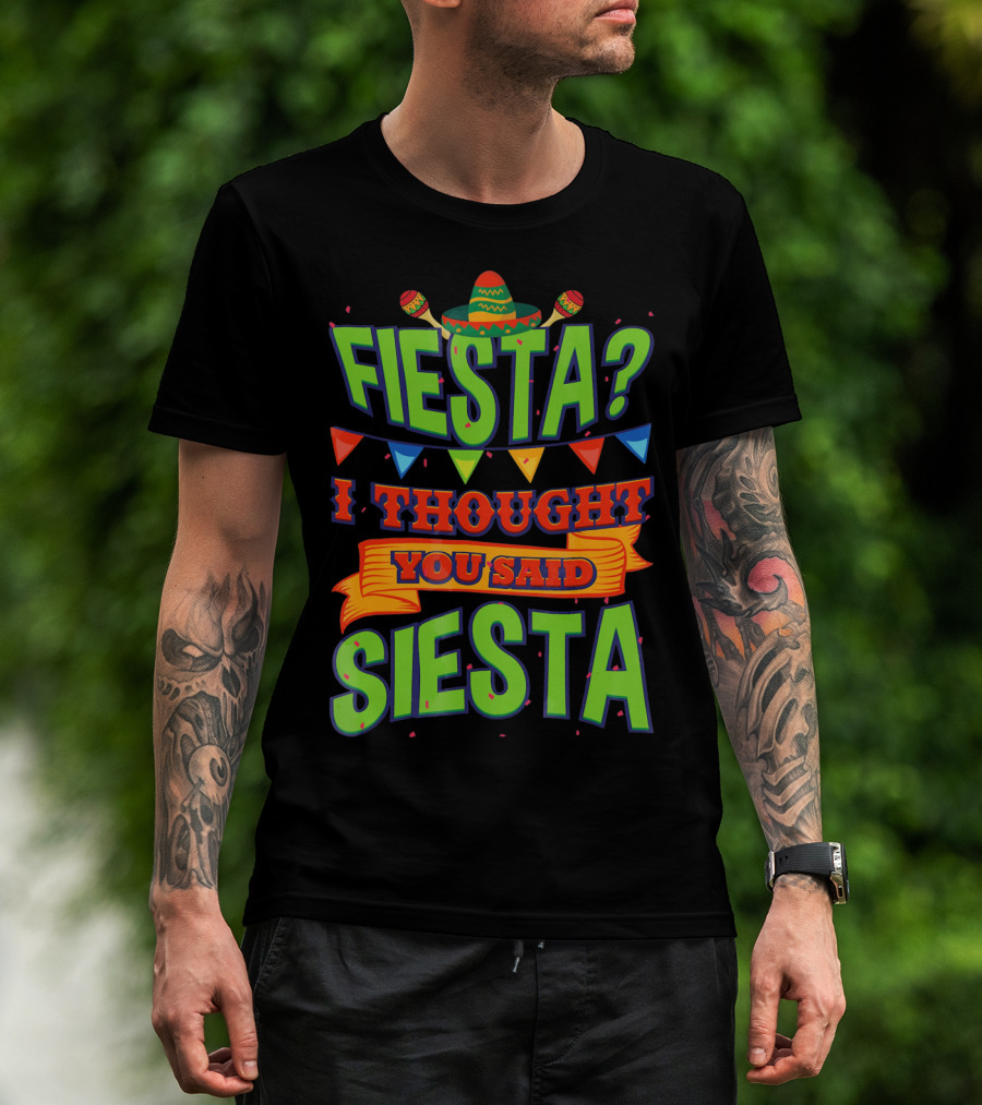 The FIESTA? I THOUGHT YOU SAID SIESTA Sombrero Maracas Flags T-shirt is designed for everyday wear and a consistent fit. Fabric is pre-shrunk ring-spun cotton with durable stitching. See the size chart below for exact measurements.