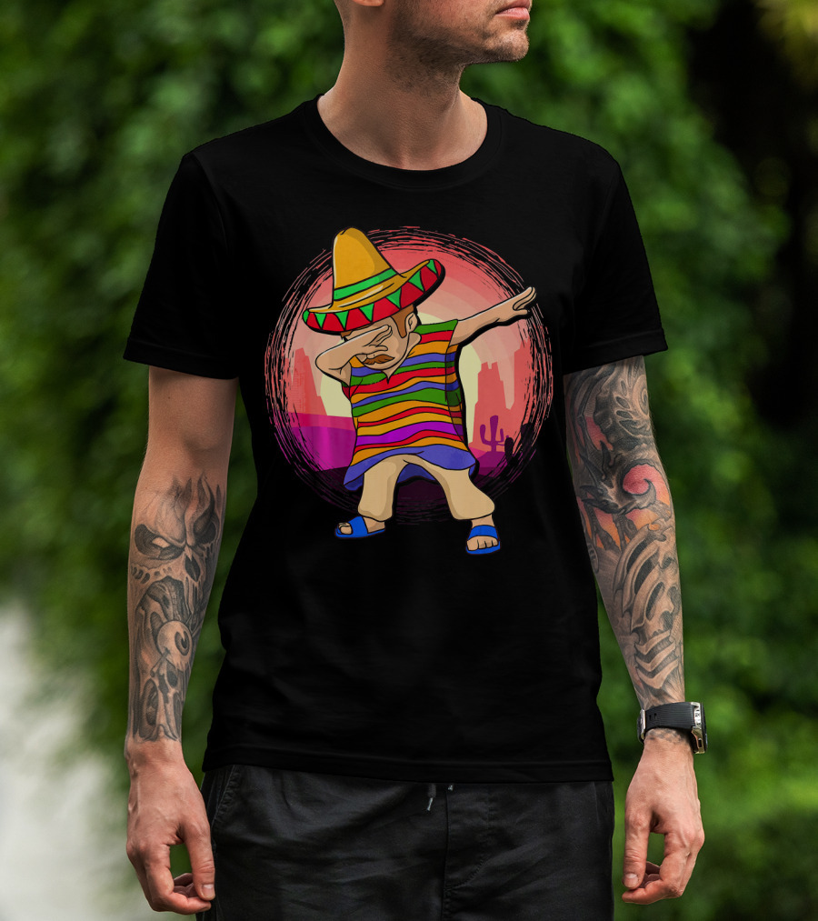 Mexican Poncho Sombrero Dabbing Sunset Cactus Background T-Shirt