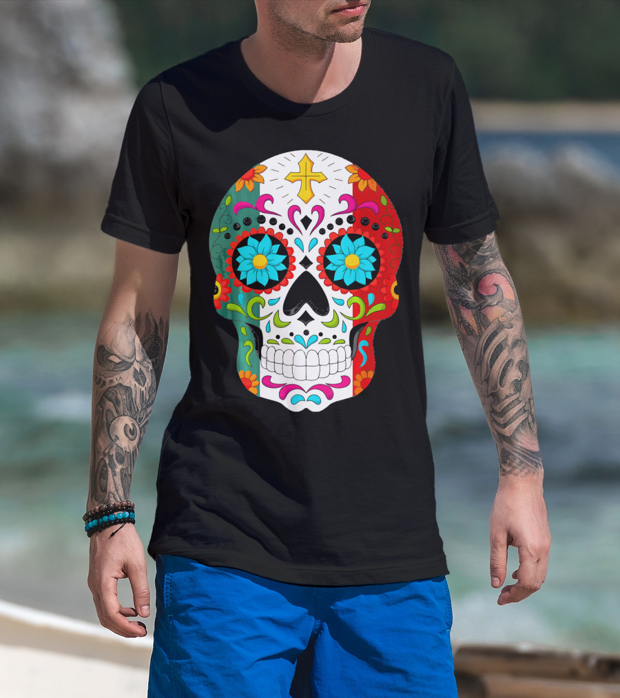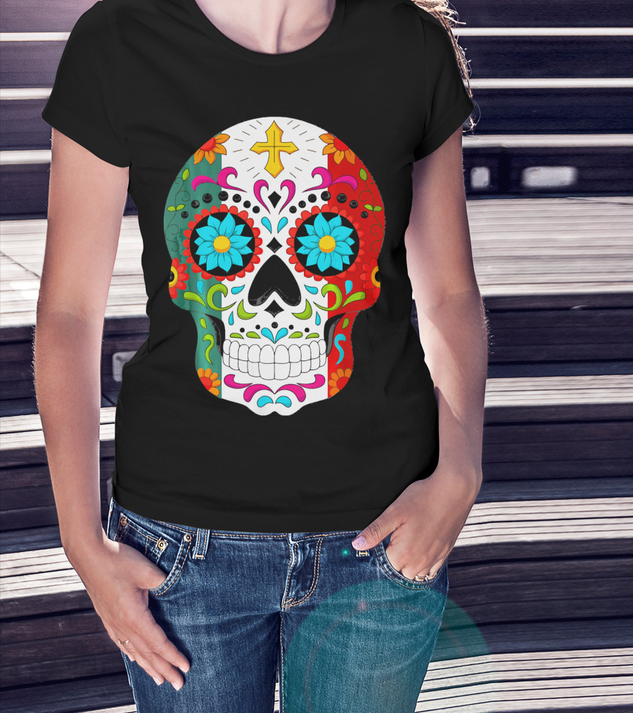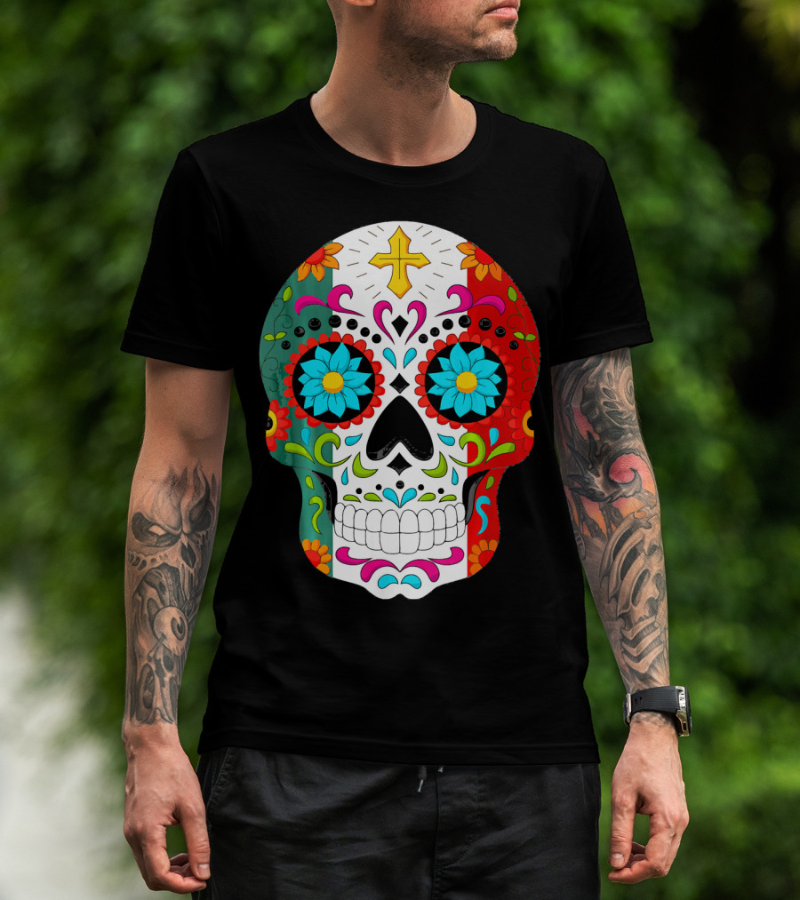 Day Of The Dead Sugar Skull Cinco De Mayo Mexican Flag Colors T-Shirt