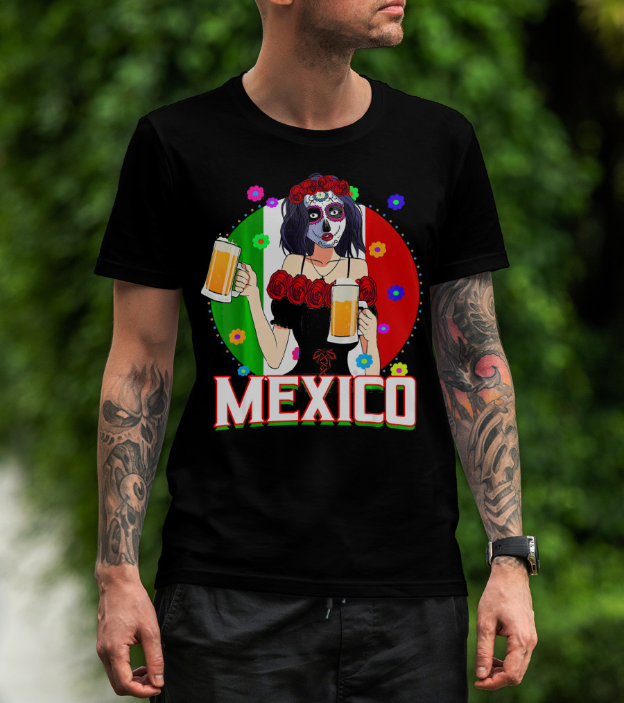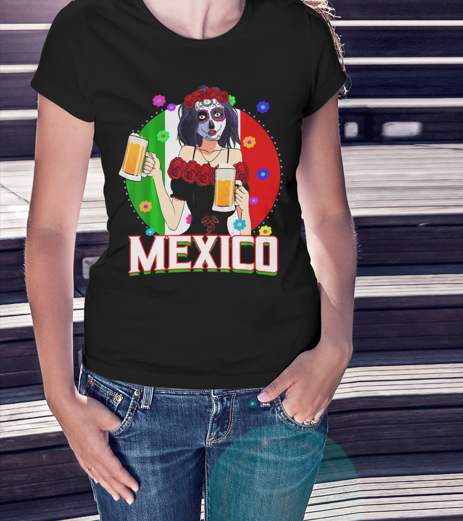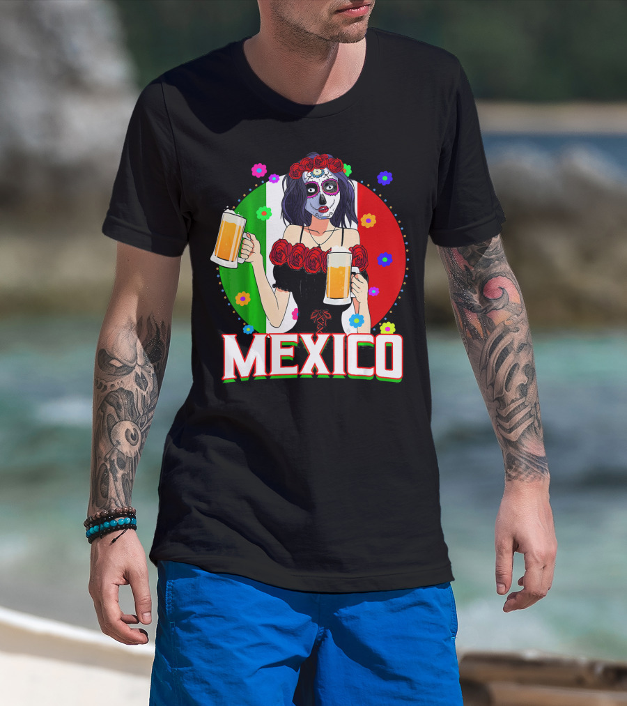 Cinco De Mayo Sugar Skull Woman Holding Beers Mexico Flag T-Shirt