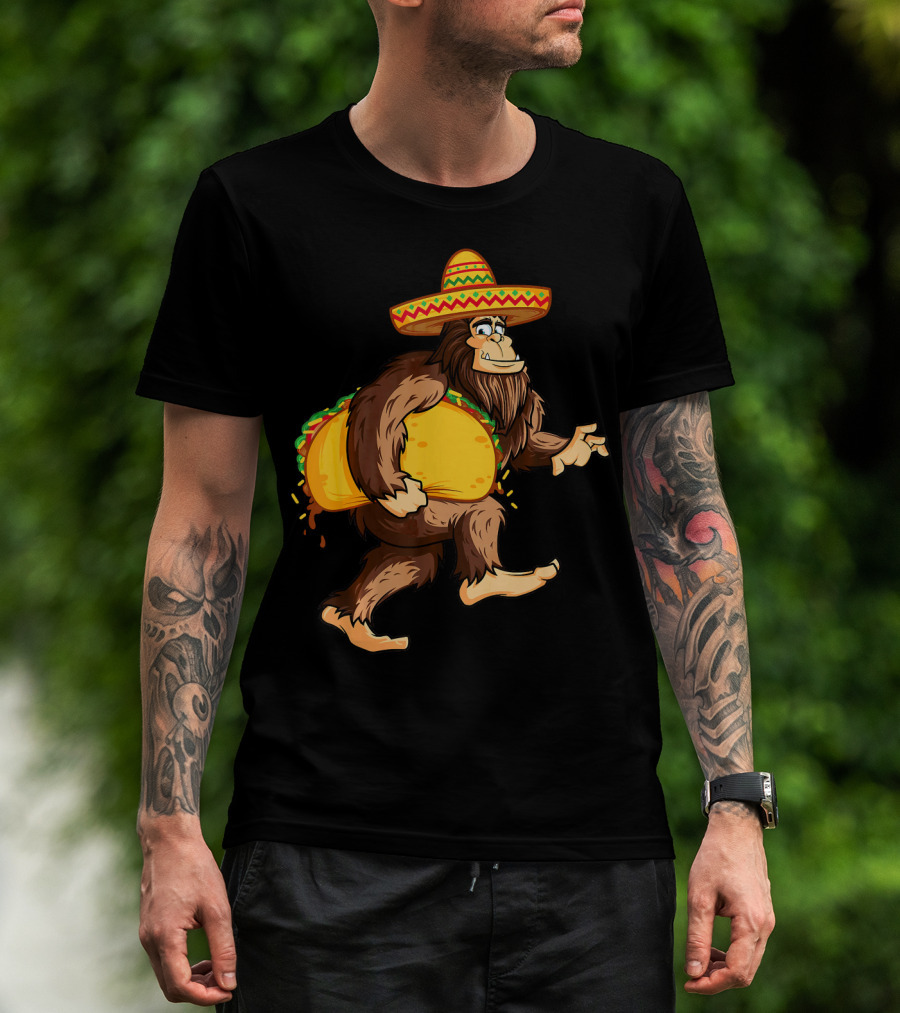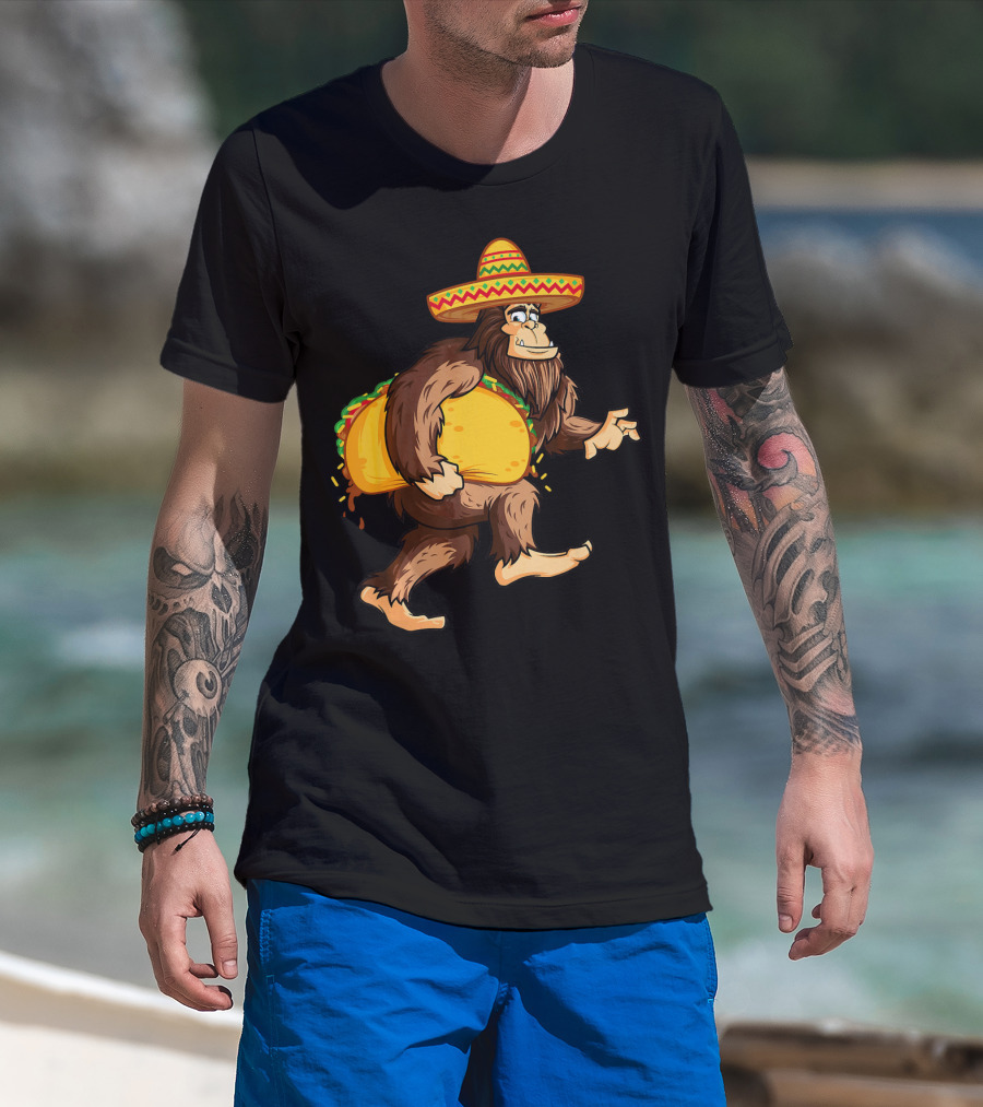 Bigfoot Celebrating Cinco De Mayo With Sombrero And Taco T-Shirt