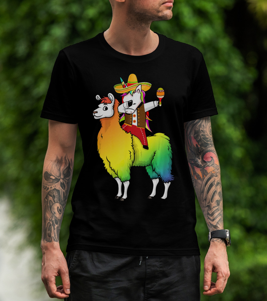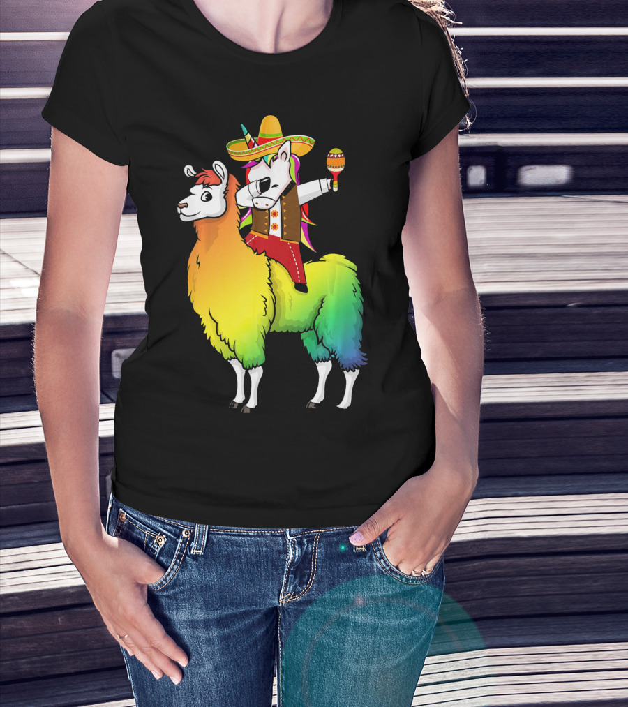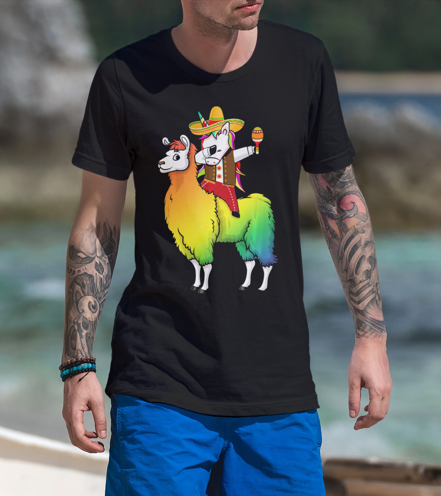 Unicorn Dabbing Riding Llama With Sombrero And Maracas Funny Cinco T-Shirt