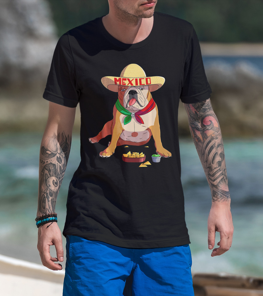 Cinco De Mayo Mexican Bulldog Wearing Sombrero With Chips And Salsa T-Shirt