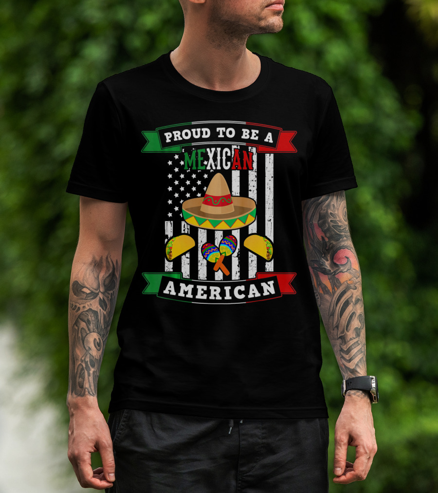 Proud To Be A Mexican American Flag Cinco De Mayo Sombrero Maracas Tacos T-Shirt