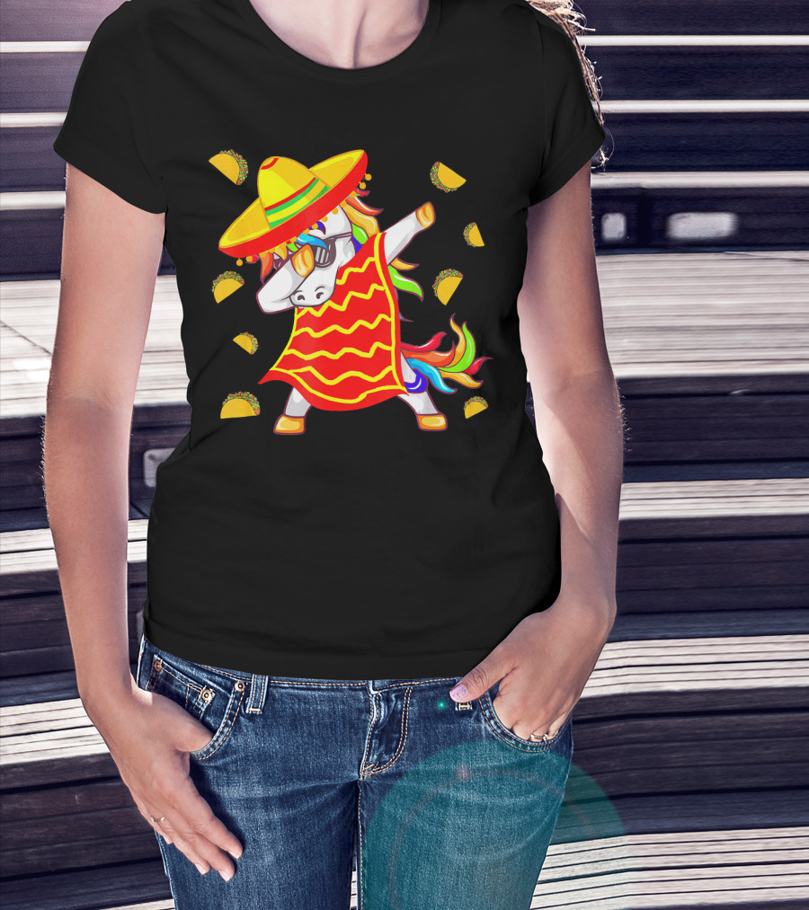 Unicorn Dabbing In Mexican Poncho With Sombrero Surrounded By Tacos T-Shirt
