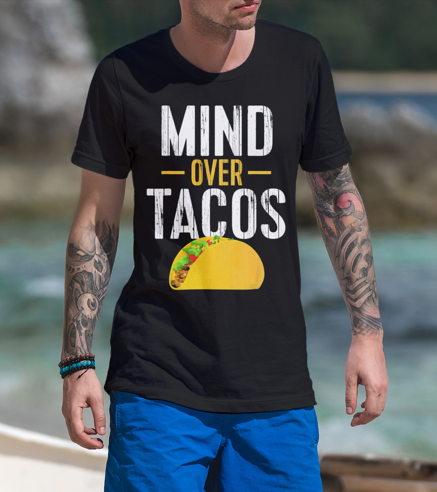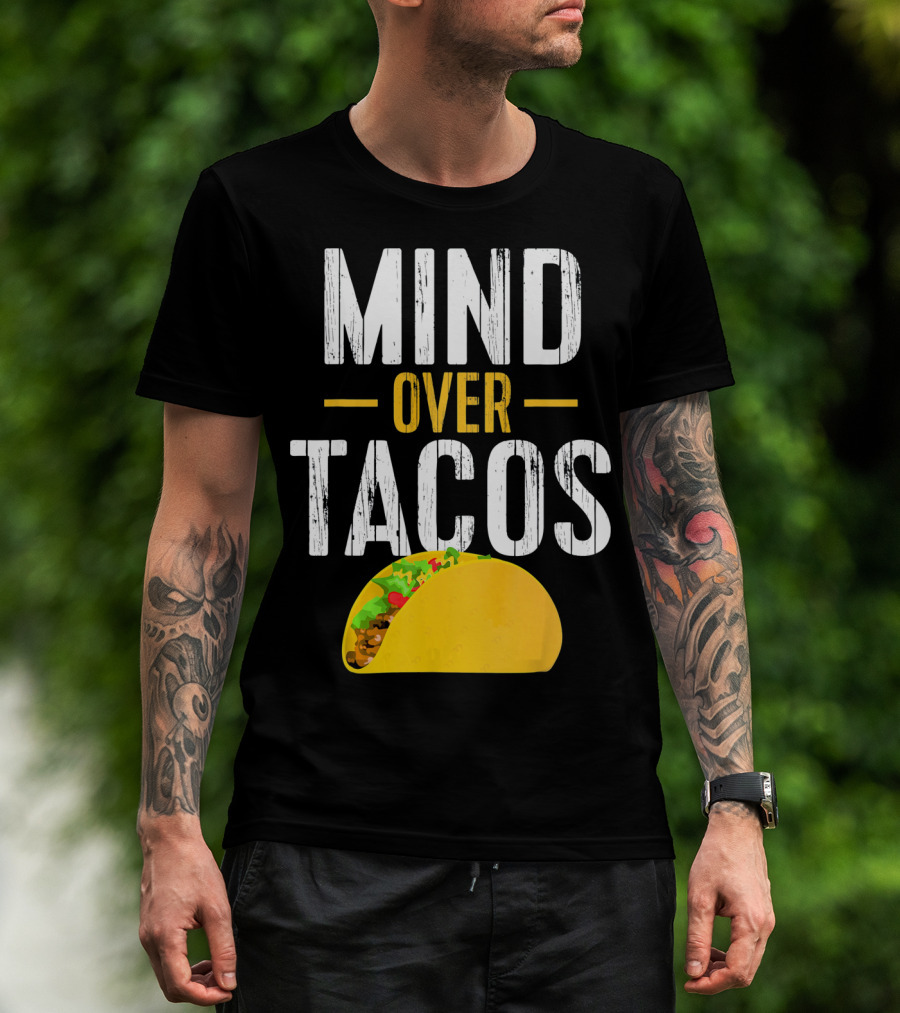 The Mind Over Tacos Funny Taco T-shirt is designed for everyday wear and a consistent fit. Fabric is pre-shrunk ring-spun cotton with durable stitching. See the size chart below for exact measurements.