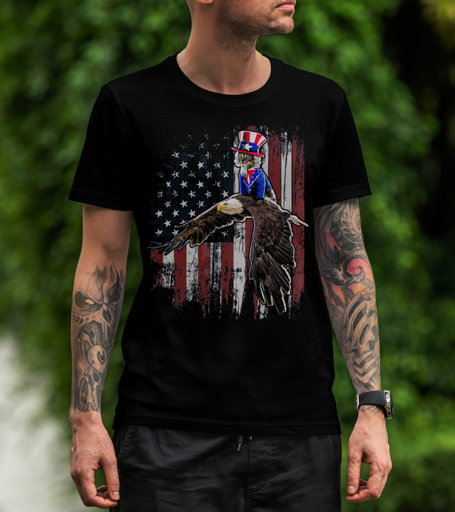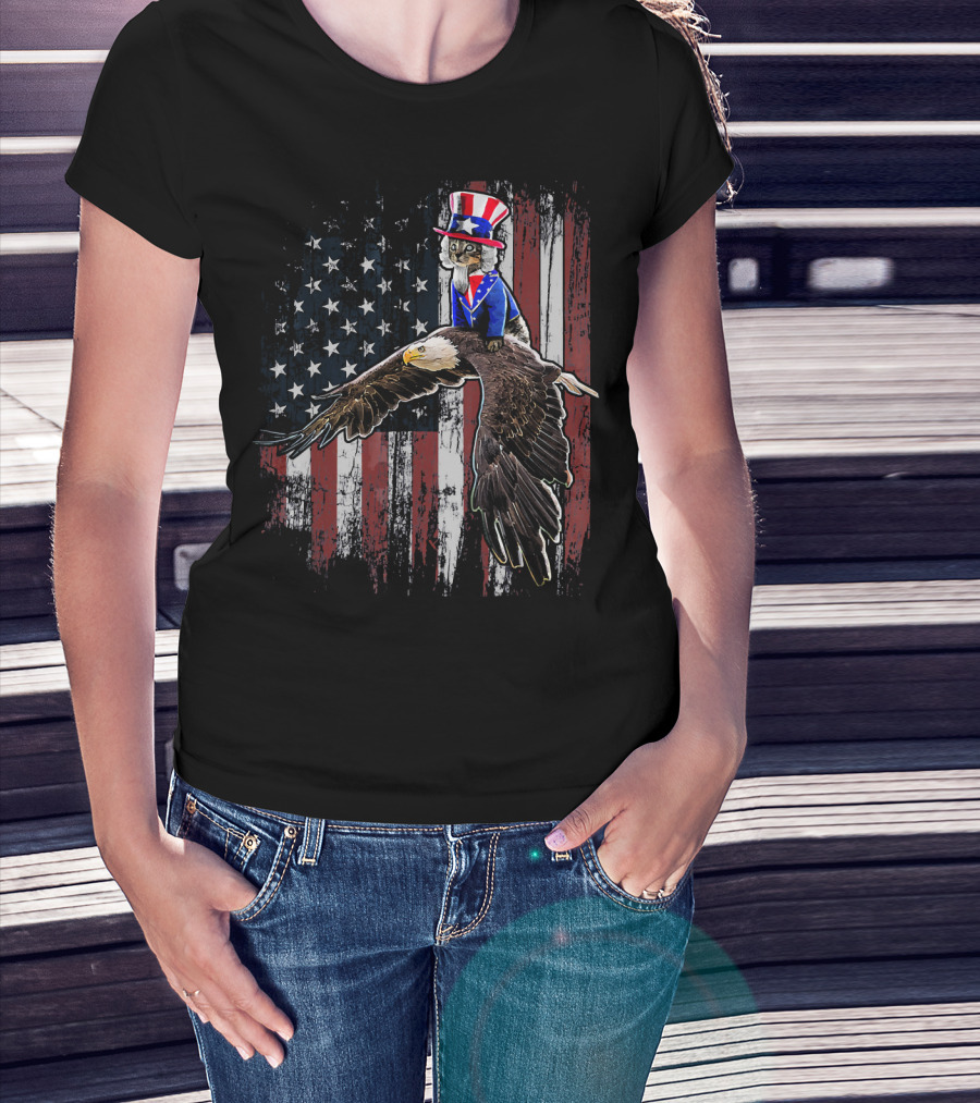 Uncle Sam Costume Cat Riding Bald Eagle On American Flag Background T-Shirt