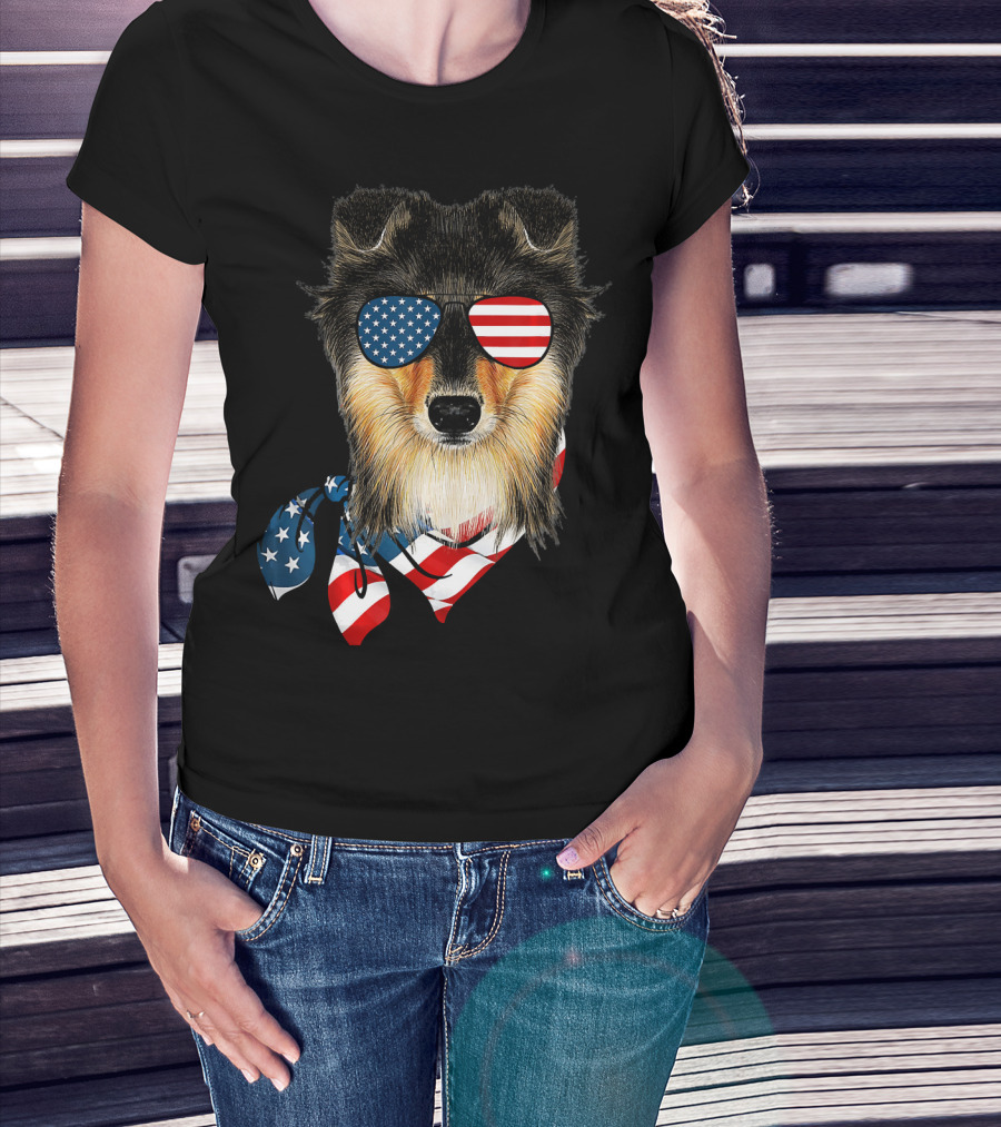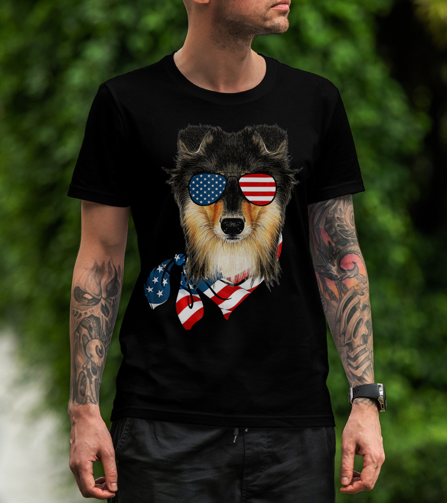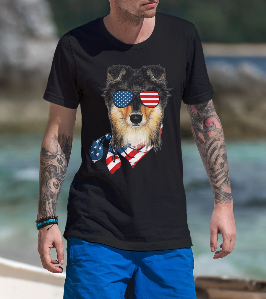 Sheltie Dog With American Flag Sunglasses And Bandana Patriotic T-Shirt