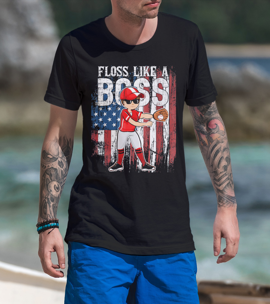 Floss Like A Boss American Baseball Spirit With Flag Background T-Shirt
