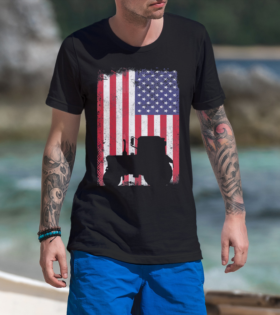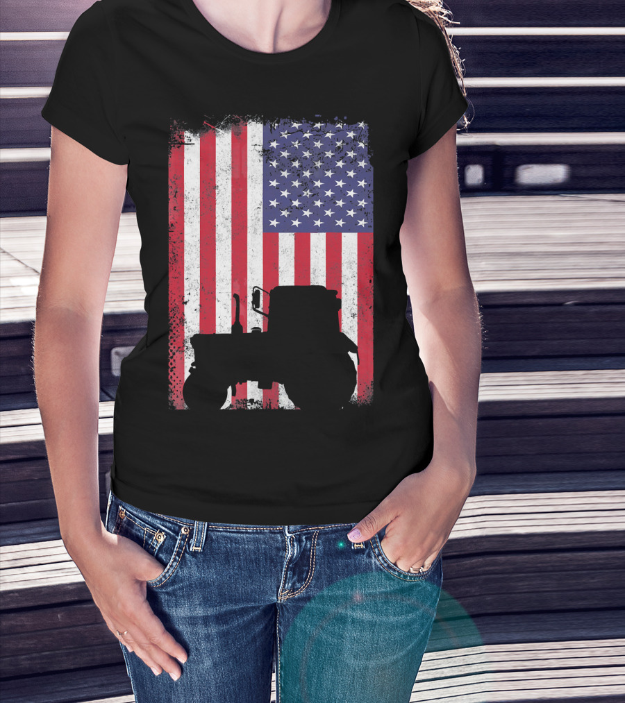 The Tractor Silhouette Against Distressed American Flag Patriotic T-shirt is designed for everyday wear and a consistent fit. Fabric is pre-shrunk ring-spun cotton with durable stitching. See the size chart below for exact measurements.