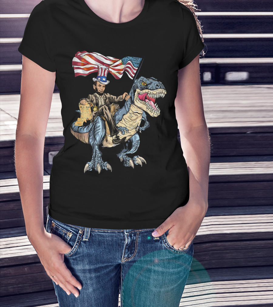 Abe Lincoln Riding Dinosaur With American Flag And Declaration T-Shirt