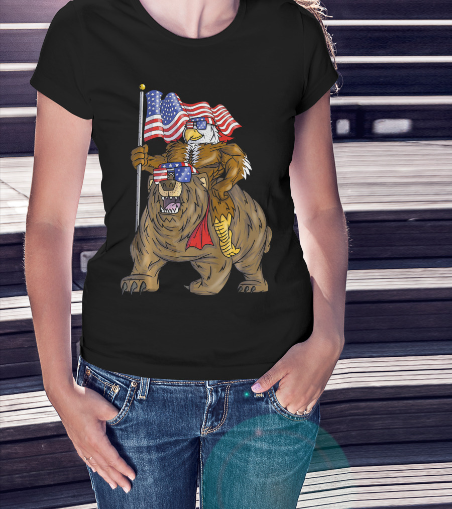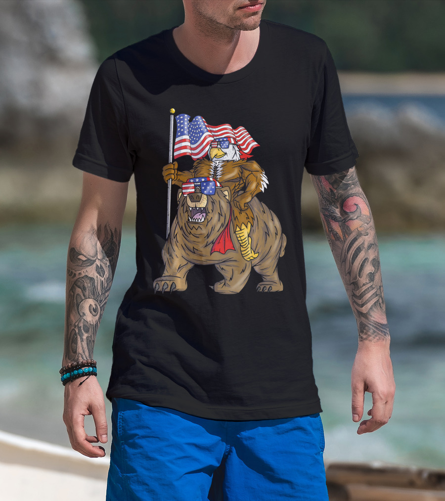 American Flag-Waving Bald Eagle Riding Bear With Sunglasses T-Shirt