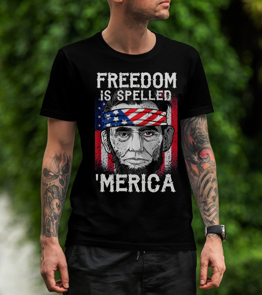 FREEDOM IS SPELLED 'MERICA Abe Lincoln Bandana American Flag T-Shirt