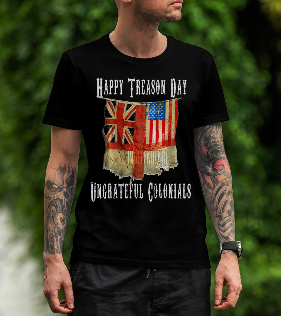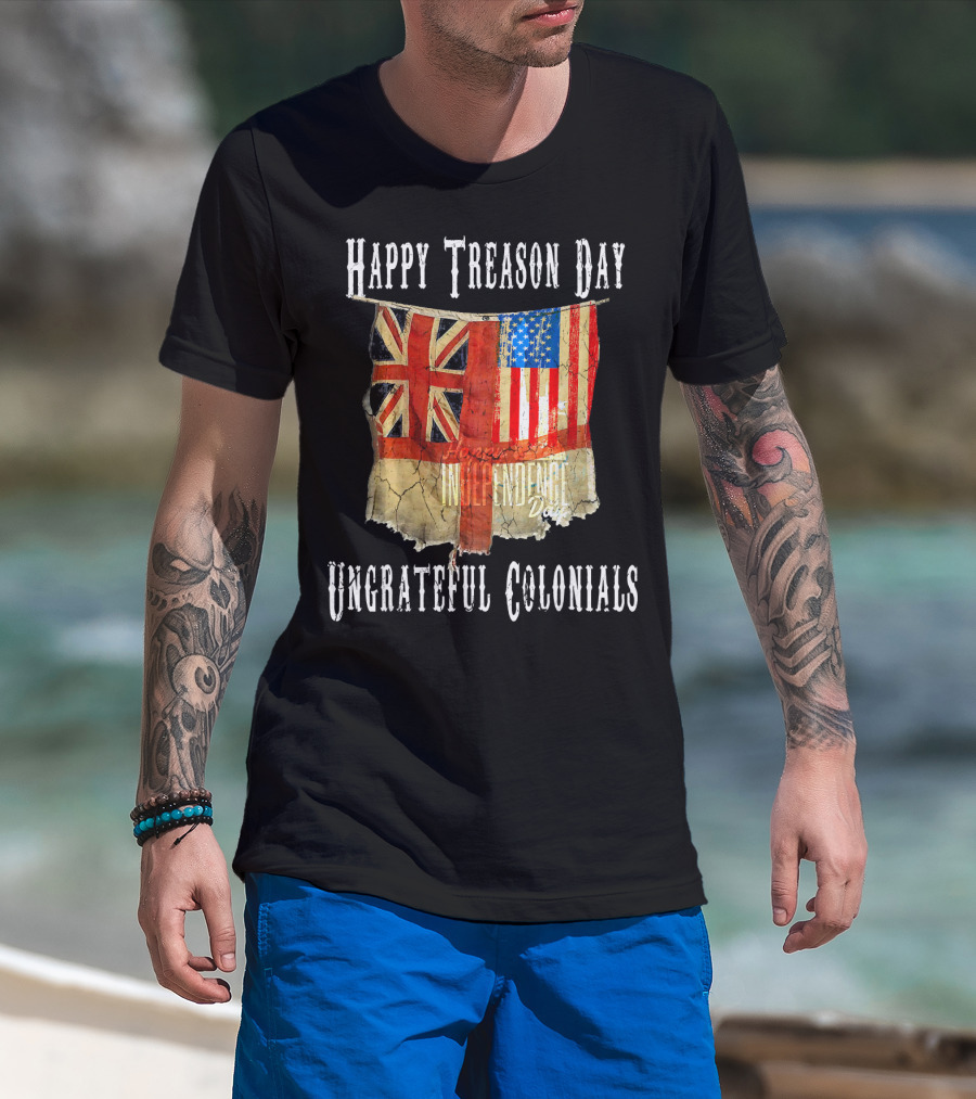 The Happy Treason Day Ungrateful Colonials America Independence Day British Flag American Flag T-shirt is designed for everyday wear and a consistent fit. Fabric is pre-shrunk ring-spun cotton with durable stitching. See the size chart below for exact measurements.