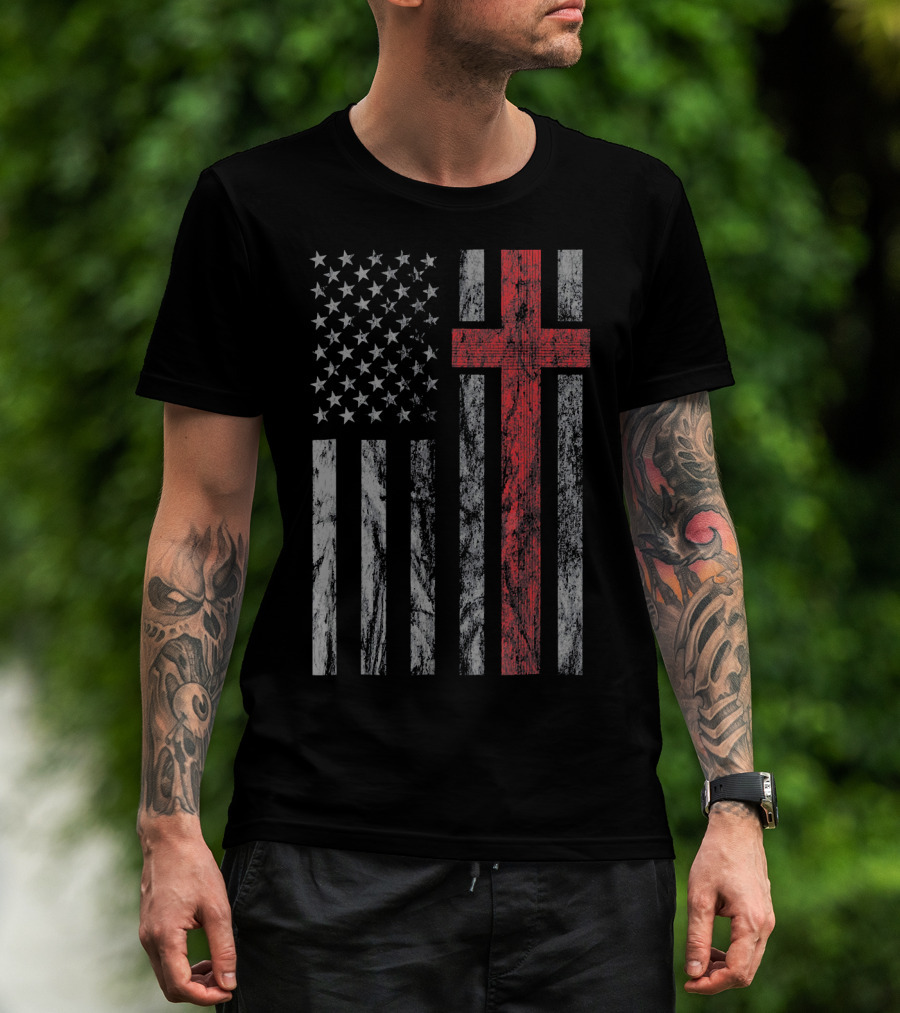 Vintage Distressed USA Flag With Red Christian Cross T-Shirt