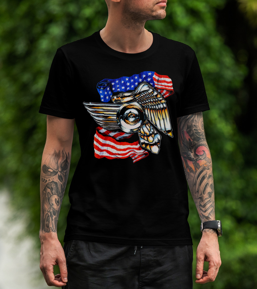 American Motorcycle Biker Eagle Emblem With Flag Wings T-Shirt