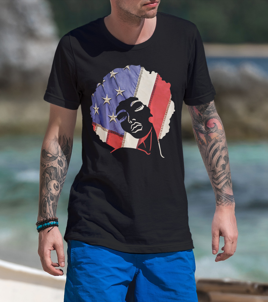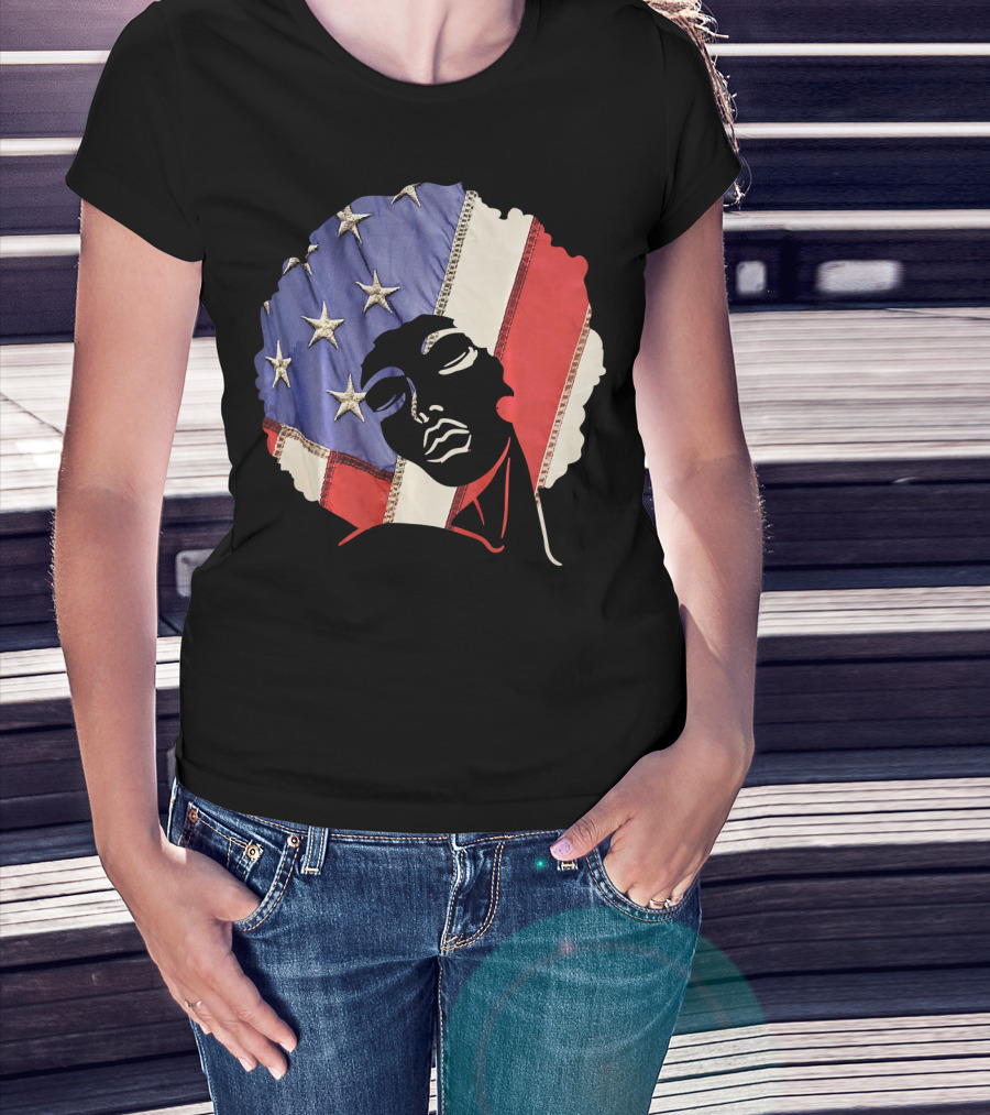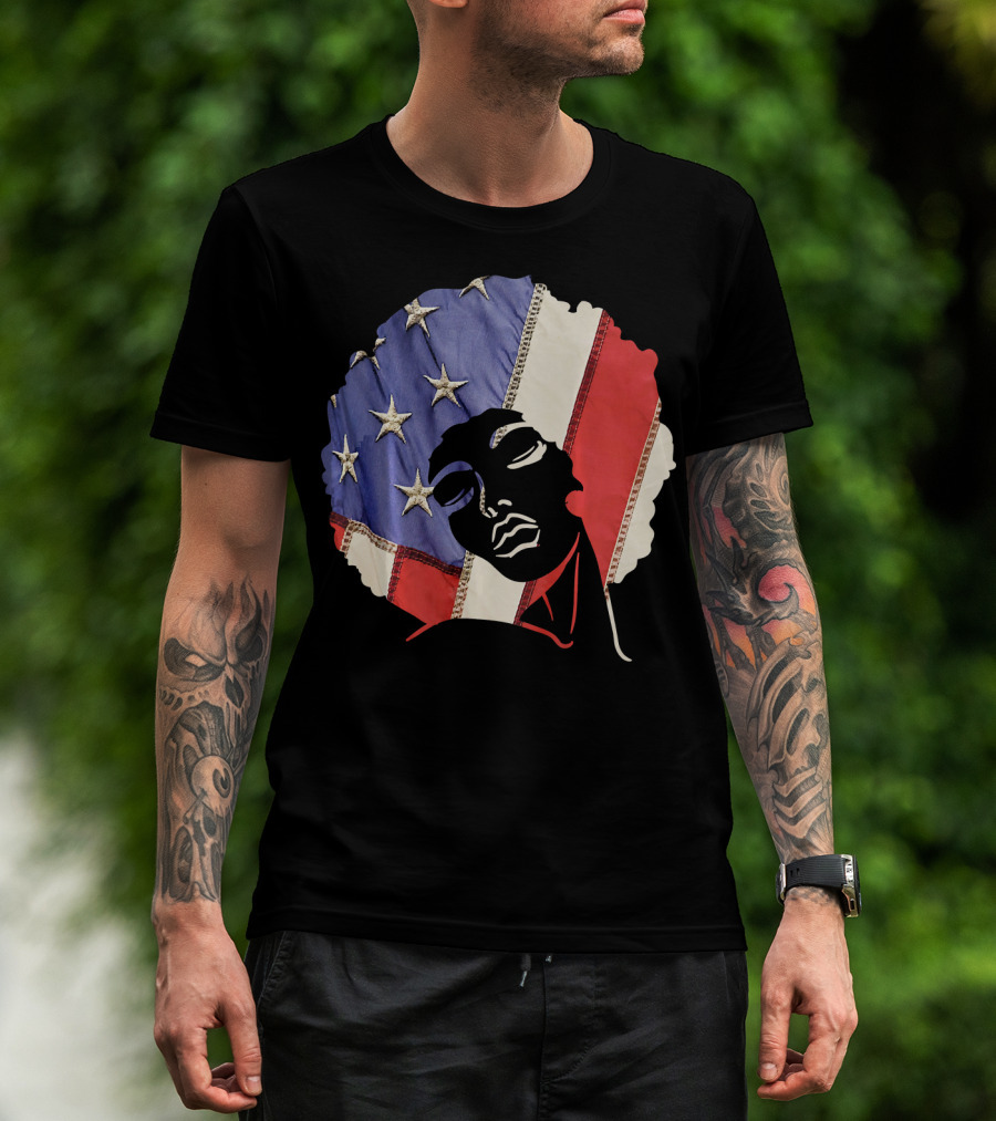 The Black Girl Melanin Afro with US Flag T-shirt is designed for everyday wear and a consistent fit. Fabric is pre-shrunk ring-spun cotton with durable stitching. See the size chart below for exact measurements.