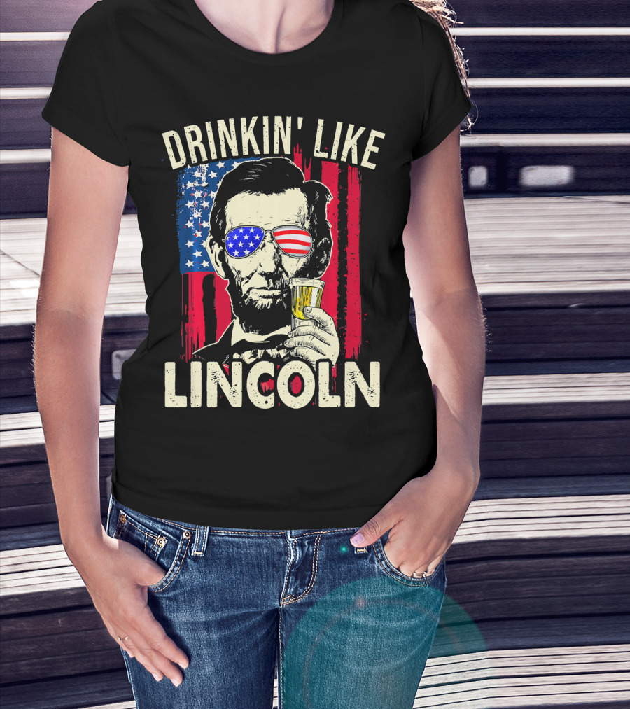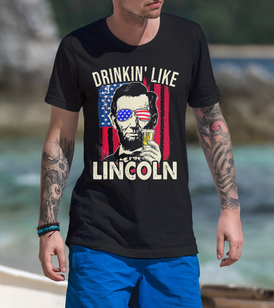 Drinkin Like Lincoln Abe Abraham Fourth Of July American Flag Sunglasses T-Shirt