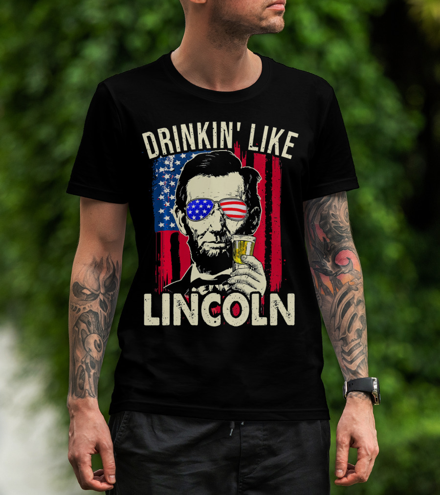 The Drinkin Like Lincoln Abe Abraham Fourth of July American Flag Sunglasses T-shirt is designed for everyday wear and a consistent fit. Fabric is pre-shrunk ring-spun cotton with durable stitching. See the size chart below for exact measurements.
