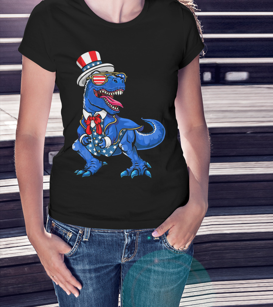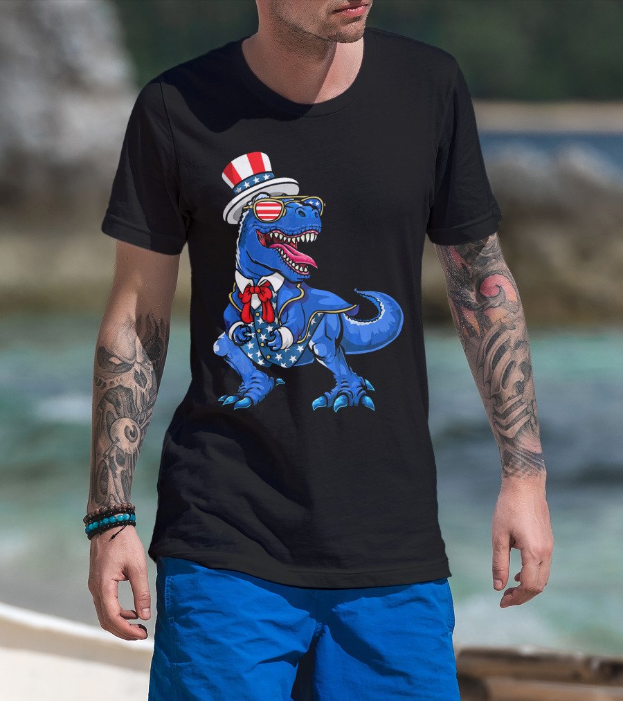 Patriotic Dinosaur With American Flag Hat And Glasses T-Shirt