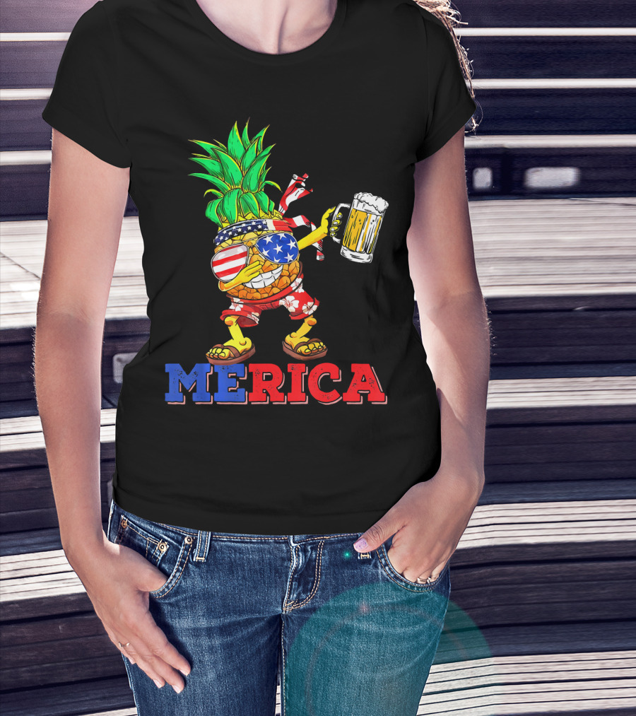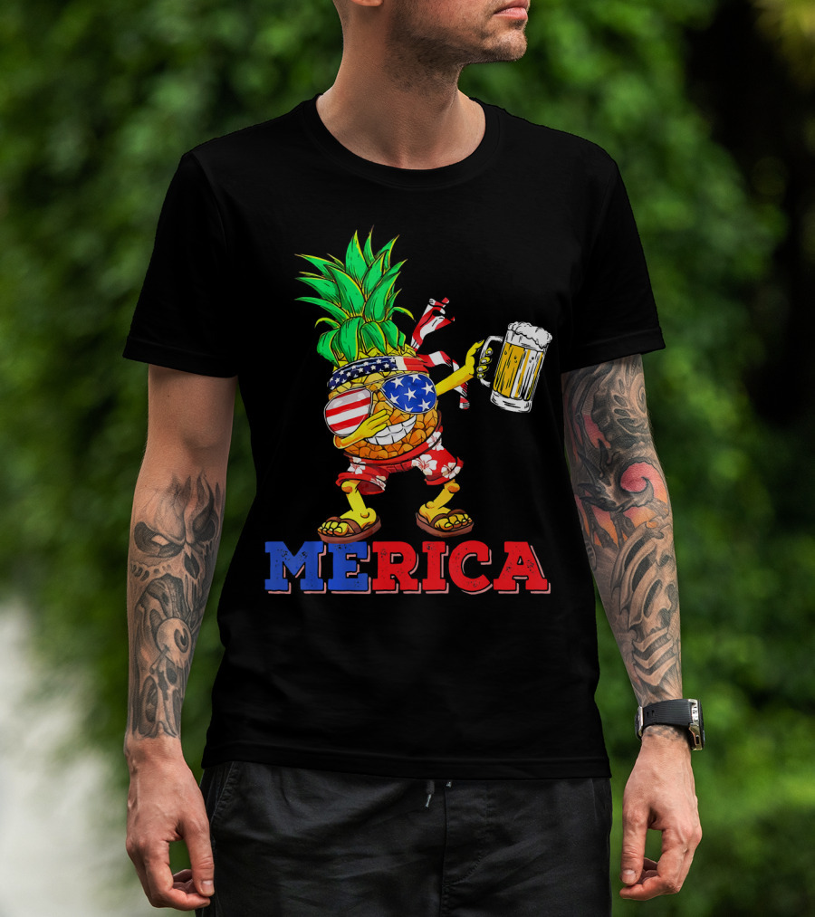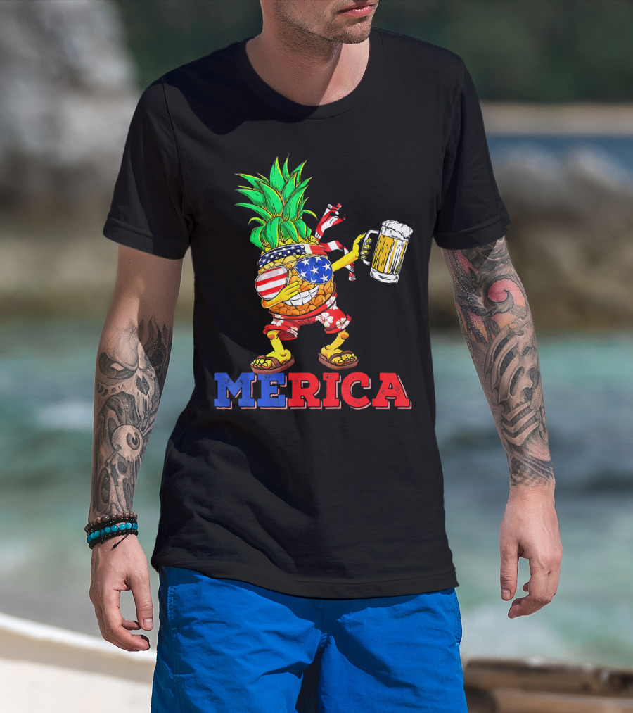 Merica Dabbing Pineapple US Flag Sunglasses Beer Mug Hawaiian Shorts T-Shirt