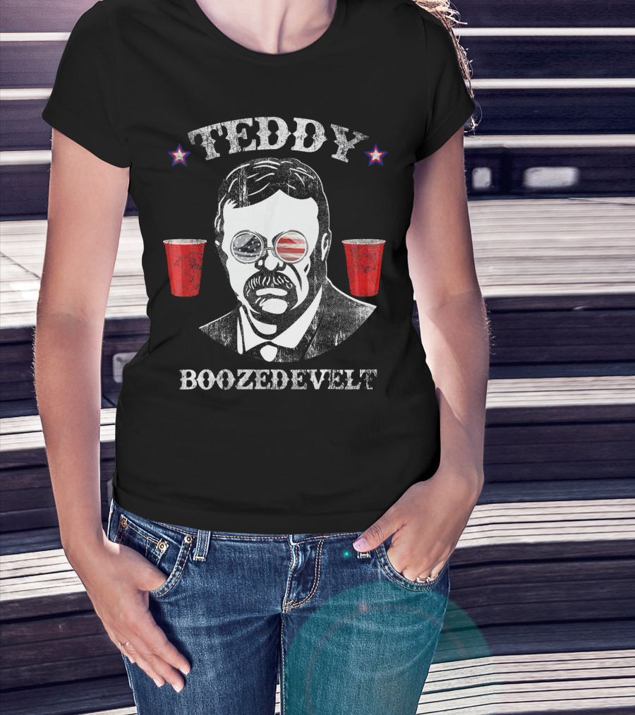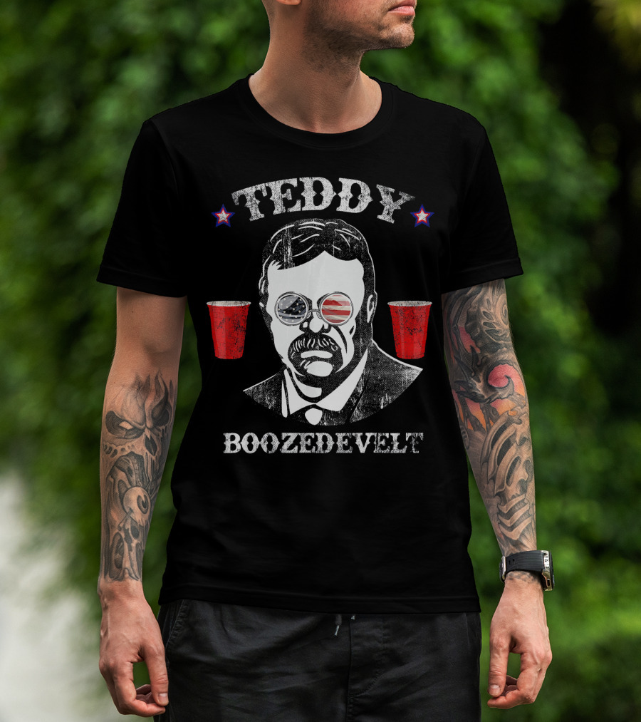 Teddy Boozedevelt Roosevelt US Flag Sunglasses Red Cups Patriotic Stars T-Shirt