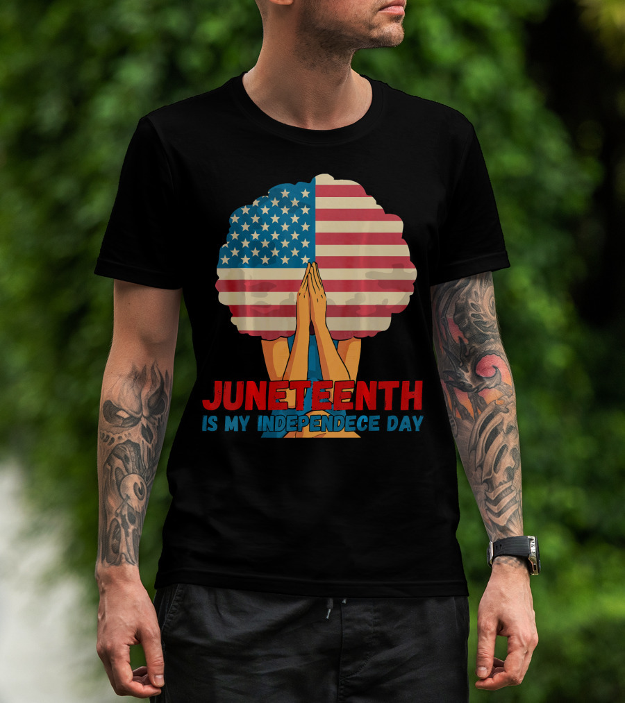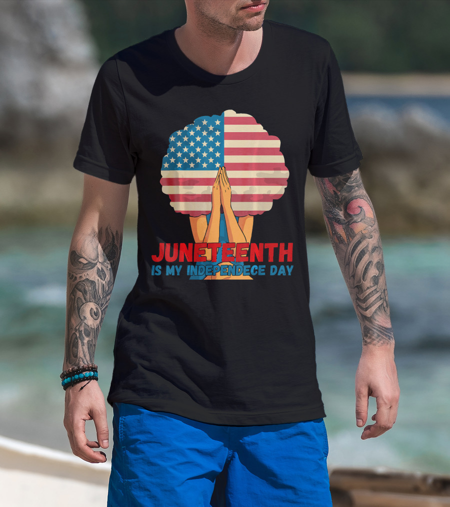 Juneteenth Is My Independence Day With American Flag Afro And Praying Hands T-Shirt