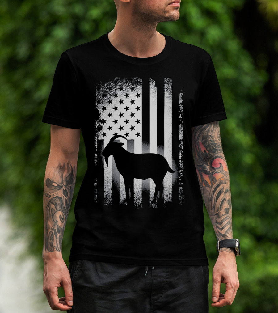 The Goat American Flag USA Patriotic Silhouette T-shirt is designed for everyday wear and a consistent fit. Fabric is pre-shrunk ring-spun cotton with durable stitching. See the size chart below for exact measurements.