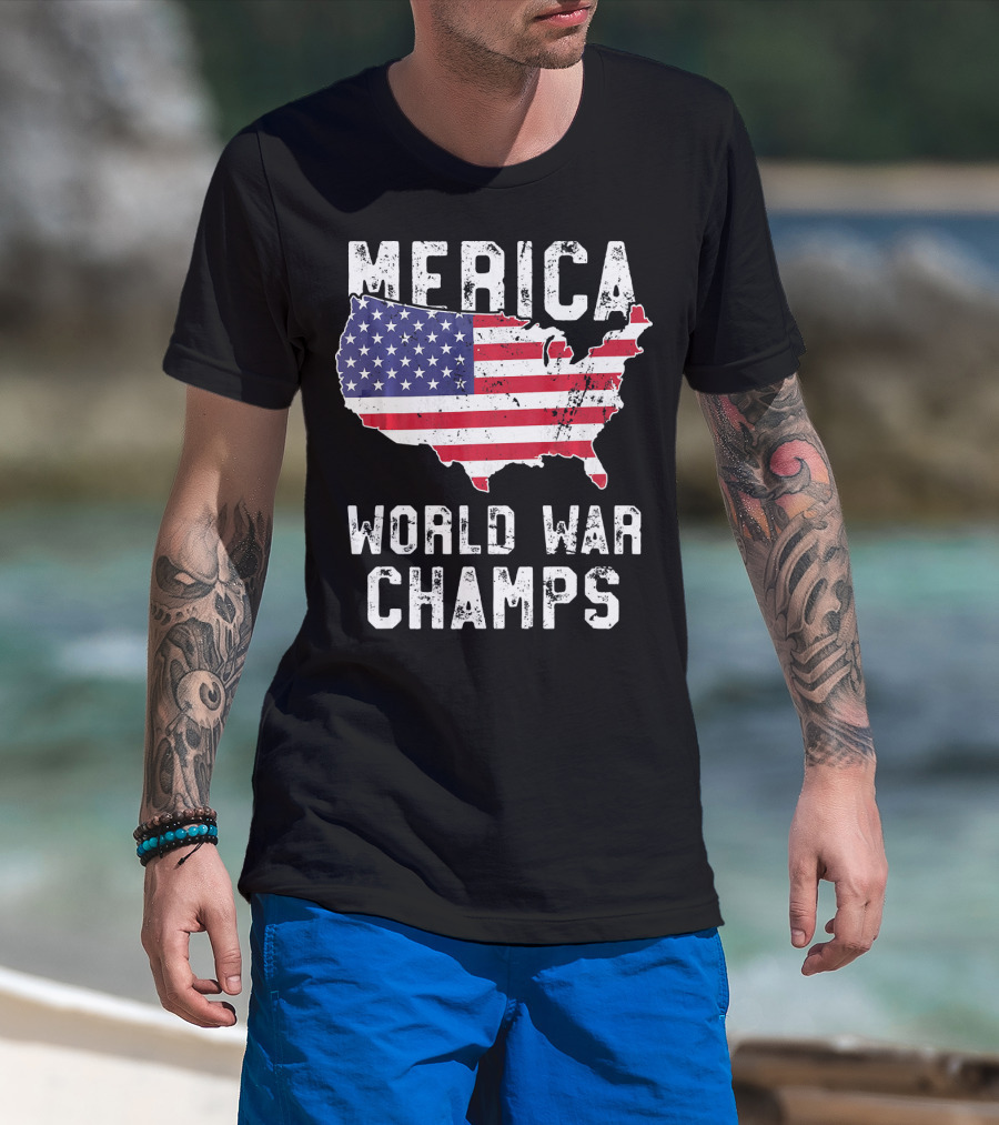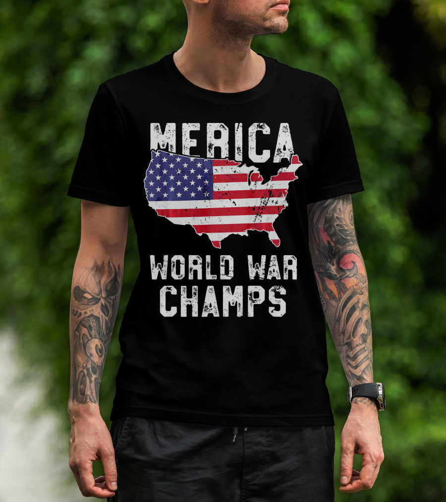 The Merica World War Champs Map with American Flag T-shirt is designed for everyday wear and a consistent fit. Fabric is pre-shrunk ring-spun cotton with durable stitching. See the size chart below for exact measurements.