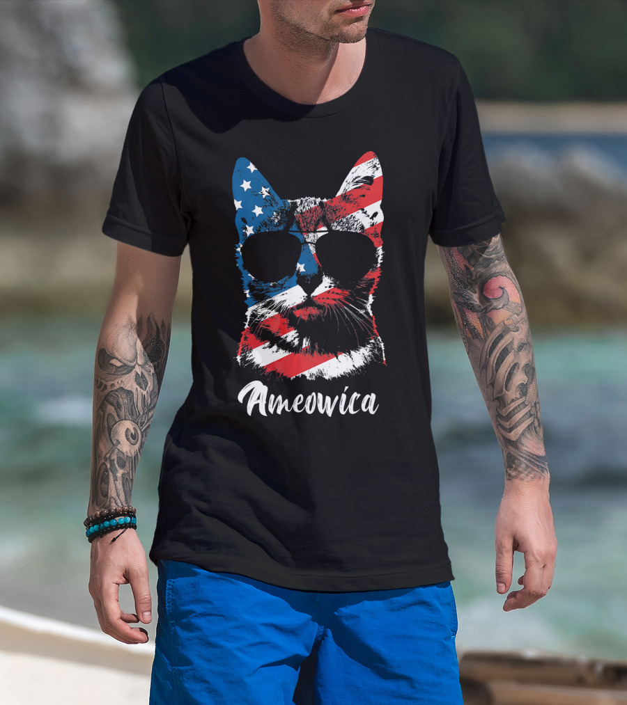 Ameowica Funny Cat Lover Patriotic Stars And Stripes Sunglasses T-Shirt