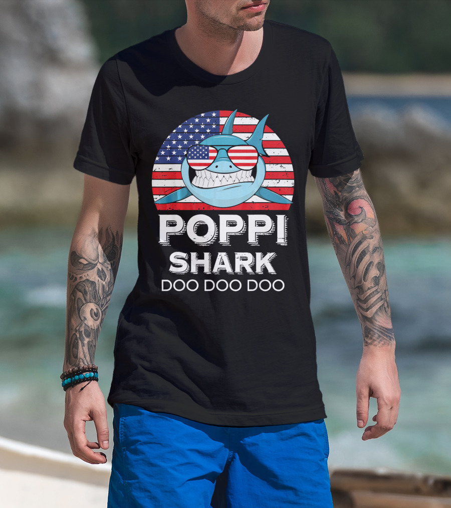 Poppi Shark Doo Doo Doo American Flag Sunglasses T-Shirt