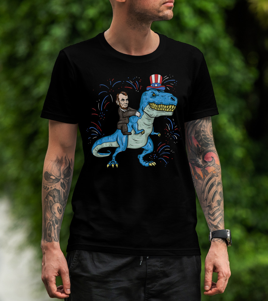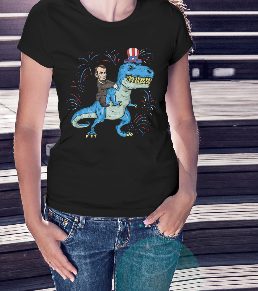 Abe Lincoln Patriotic Dinosaur Riding Fireworks Hat T-Shirt